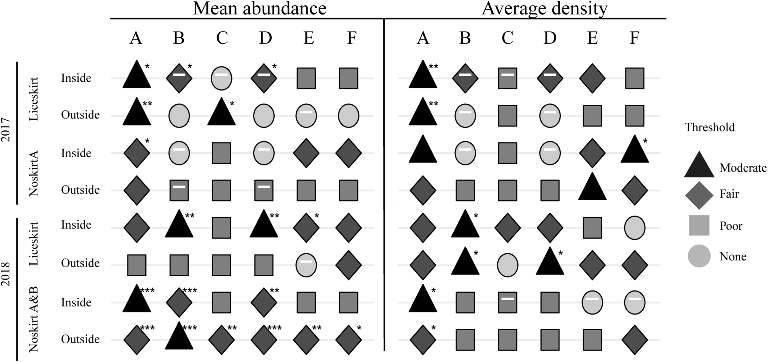 | Inside | Liceskirt | 1.46 ± 2.24 | 0.15 ± 0.36 | 6.75 (1.40–40.0)** |