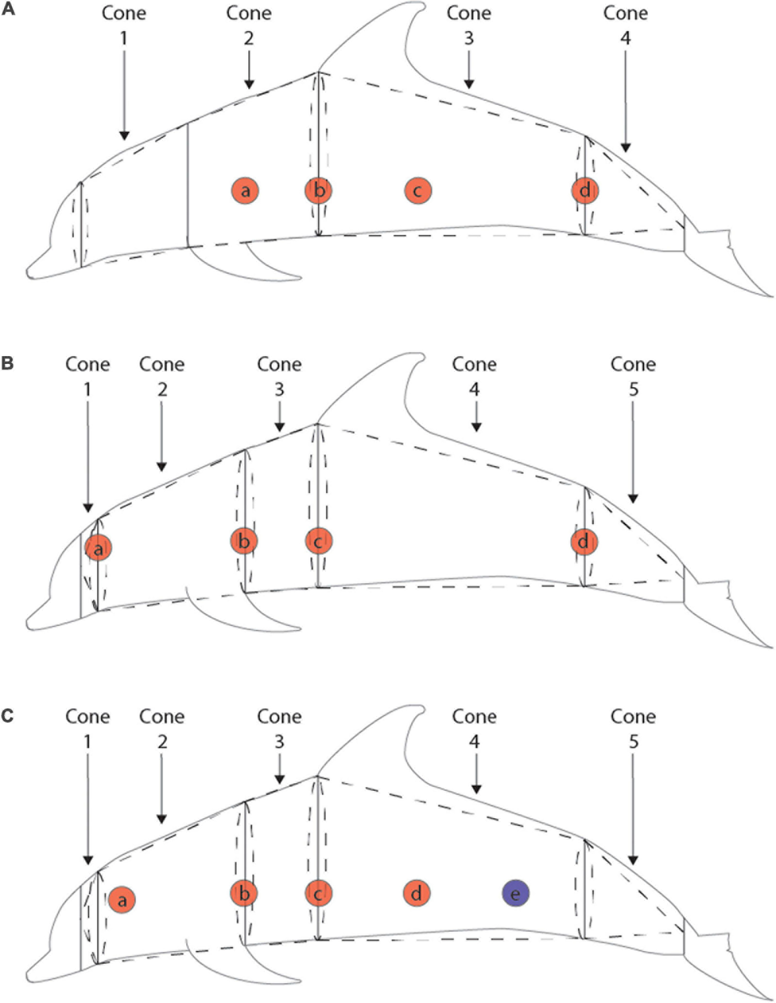 Girth, blubber depth, and truncated cones methods for three time periods: pre-1989 (A), 1989–2012 (B), and post-2012 (C). Solid lines indicate placement of girth measurements, red circles indicate lateral placement of ultrasound measurements of blubber depth, blue circles indicate approximate location of caudal biopsy of blubber depth, and dotted lines represent the breakdown of cones used in the truncated cones calculations. For the pre-1989 measurements, the average of blubber depths a and b were averaged for cones 1 and 2, the average of blubber depths b and c were used for cone 3, and blubber depth d was used for cone 4. For the 1989–2012 measurements, blubber depth a was used for cone 1, the average of blubber depths a and b were used for cone 2, the average of blubber depths b and c were used for cone 3, the average of blubber depths c and d were used for cone 4, and blubber depth d was used for cone 5. For the post-2012 measurements blubber depth a was used for cone 1, the average of blubber depths a, b, and c were used for cones 2 and 3, and the average of blubber depths c, d, and e were used for cones 4 and 5.