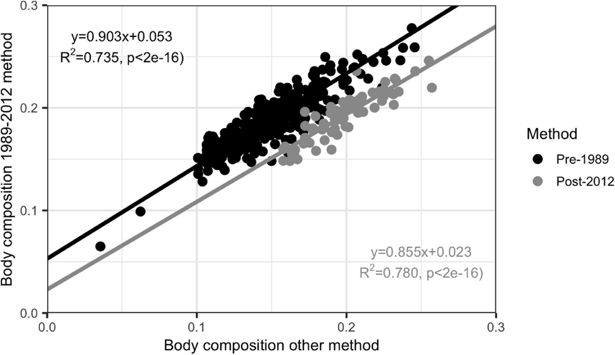 To ensure that data were comparable across the time series, we used measurements from the 1989 to 2012 methods to calculate body composition for the same individuals using the pre-1989 and post-2012 methods. We then calculated regression coefficients comparing the body composition calculated using the 1989–2012 method to pre-1989 (LM R2 = 0.735, p << 0.01) and post-2012 (LM R2 = 0.780, p << 0.01) and used those coefficients to correct the pre-1989 and post-2012 calculations to the 1989–2012 method (Figure 2).
