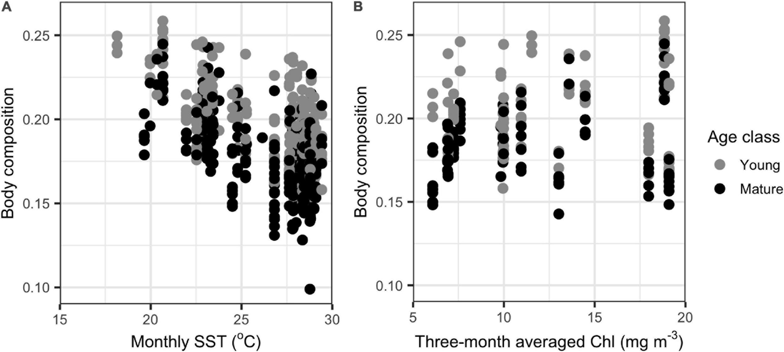 Comparison of the relationship between monthly sea surface temperature (SST) and body composition (n = 254 and n = 280 for young and mature individuals, respectively) (A) and CPUE and body composition (n = 73 and n = 84 for young and mature individuals, respectively) (B) for common bottlenose dolphins (Tursiops truncatus) in Sarasota Bay. Monthly SST data were extracted from HadISST Average Sea Surface Temperature at 1° spatial resolution.