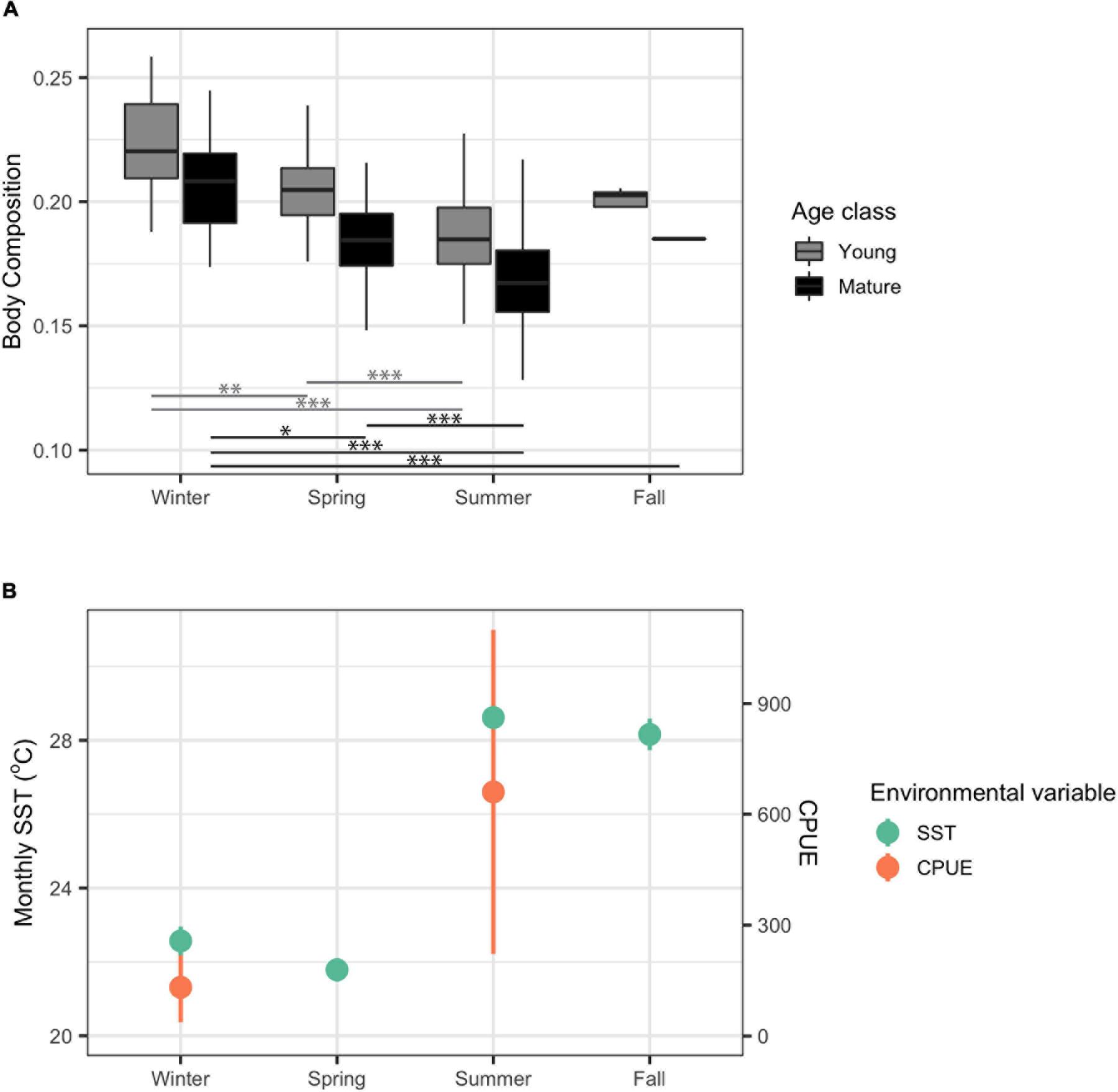 Body composition for young and mature (n = 254 and n = 280, respectively) common bottlenose dolphins (Tursiops truncatus) in Sarasota Bay by season from data collected from 1986 to 2016 (A) and monthly sea surface temperature (SST) and catch per unit effort (CPUE) in Sarasota Bay average by season during the years 1986–2016, 2003–2016, and 2006–2016, respectively (B). Significance from Dunn test results are indicated by one asterisk (p < 0.05), two asterisks (p < 0.001), and three asterisks (p < 0.0001). Monthly SST data were extracted from HadISST Average Sea Surface Temperature at 1° spatial resolution. CPUE data were collected from seine trawls in winter and spring in Sarasota Bay.