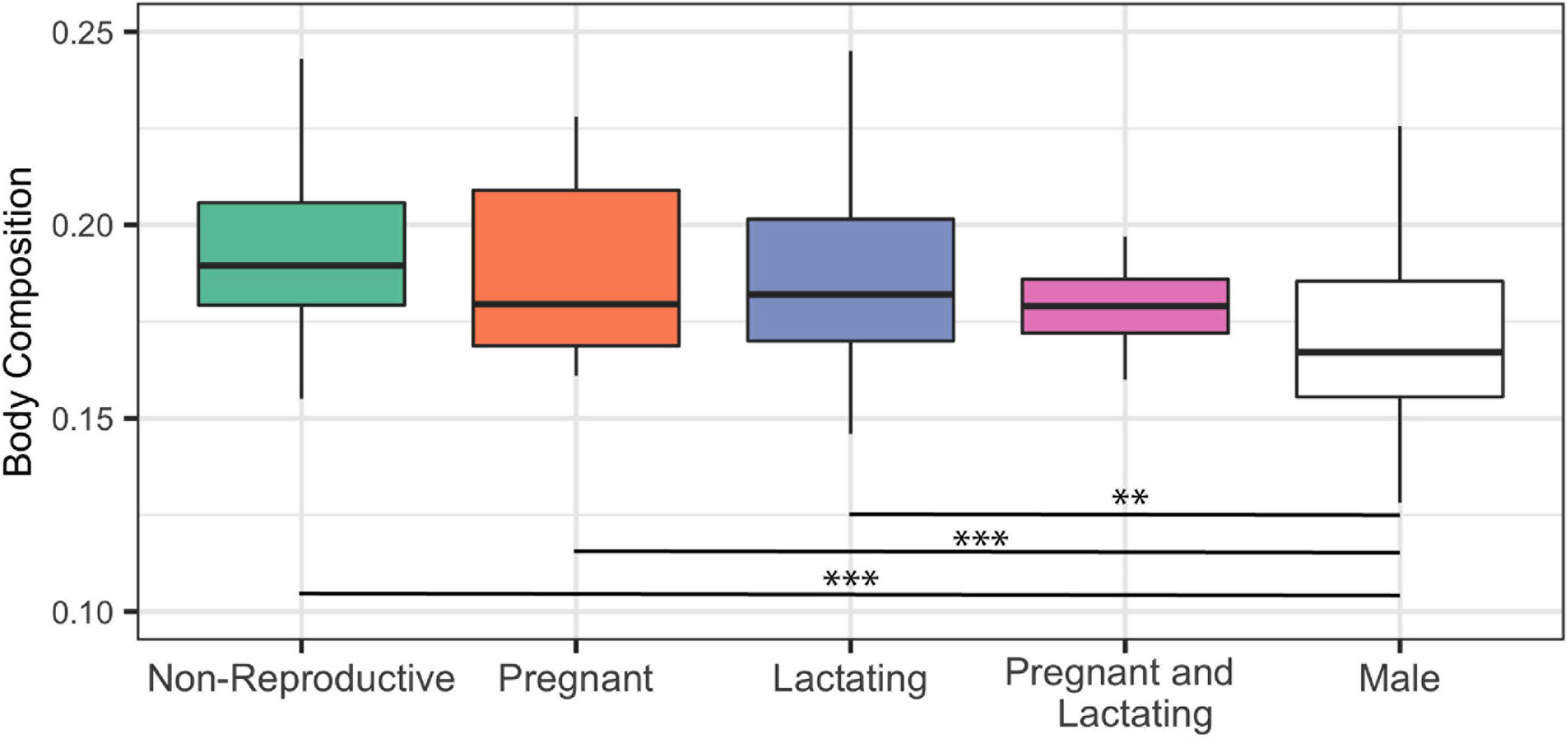 We found no significant difference in female’s body composition in different reproductive states (Figure 6). However, when re-running the Kruskal-Wallis test including reproductively active males, both pregnant and lactating mature females had significantly higher body composition than that of mature males, while mature females that were simultaneously pregnant and lactating had a body composition similar to that of males (Figure 6).