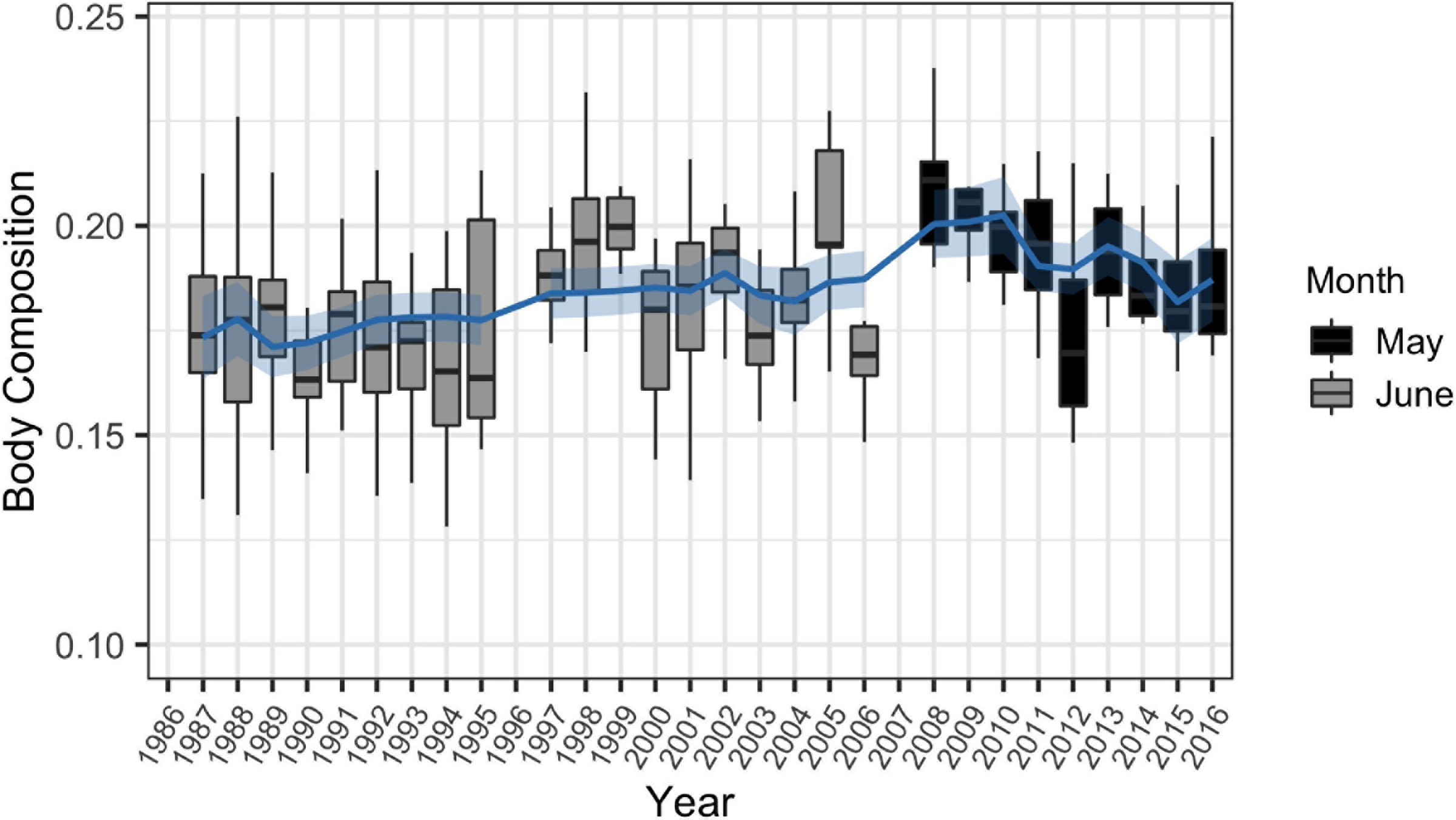To assess long-term trends in body composition we applied a GAM to the relationship between year and body composition for all dolphins, incorporating covariates of annually averaged SST and annually averaged CPUE. Due to a sampling bias in the months of data collection, with 76% of data collected in May and June, average body composition collected in June from 1986 to 2006 and May from 2007 to 2016 were used for this analysis. Models were fit from 1986 to 2016 (n = 409) and from 2004 to 2016 (when CPUE data were available; n = 125) to ensure that the best fit model was not impacted by limitations of CPUE. All combinations of monthly SST, seasonal CPUE, and the interaction between monthly SST and seasonal CPUE were run and the best fit model was selected using AICc.