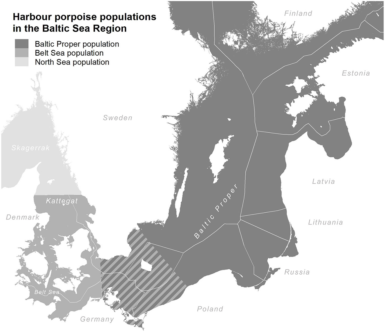 Map showing the approximate distributions of harbor porpoise populations in the Baltic Sea Region (after Sveegaard et al., 2015; Carlén et al., 2018).