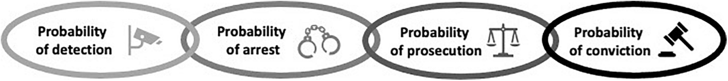 The probability of detection has two aspects: perceived and real probabilities. The perceived probability of detection is that which actors believe to occur. This can be estimated through social surveys (King and Sutinen, 2010; Arias and Sutton, 2013; Arias et al., 2015). The real probability of detection is the number of illegal acts detected versus the total number of illegal acts. This is difficult to determine because non-compliance is clandestine. In terrestrial contexts, the real probability of detection is estimated to be below 4% (Eliason, 1999). In fisheries, the real probability of detection is considered to be below 1% (Sutinen et al., 1990; Kuperan and Sutinen, 1998). Detecting illegal fishing is complex as it can involve many rules such quotas, size limits, zoning, and gear regulations. Hence, it is generally easier to estimate the perceived probability of detection than the real probability of detection.