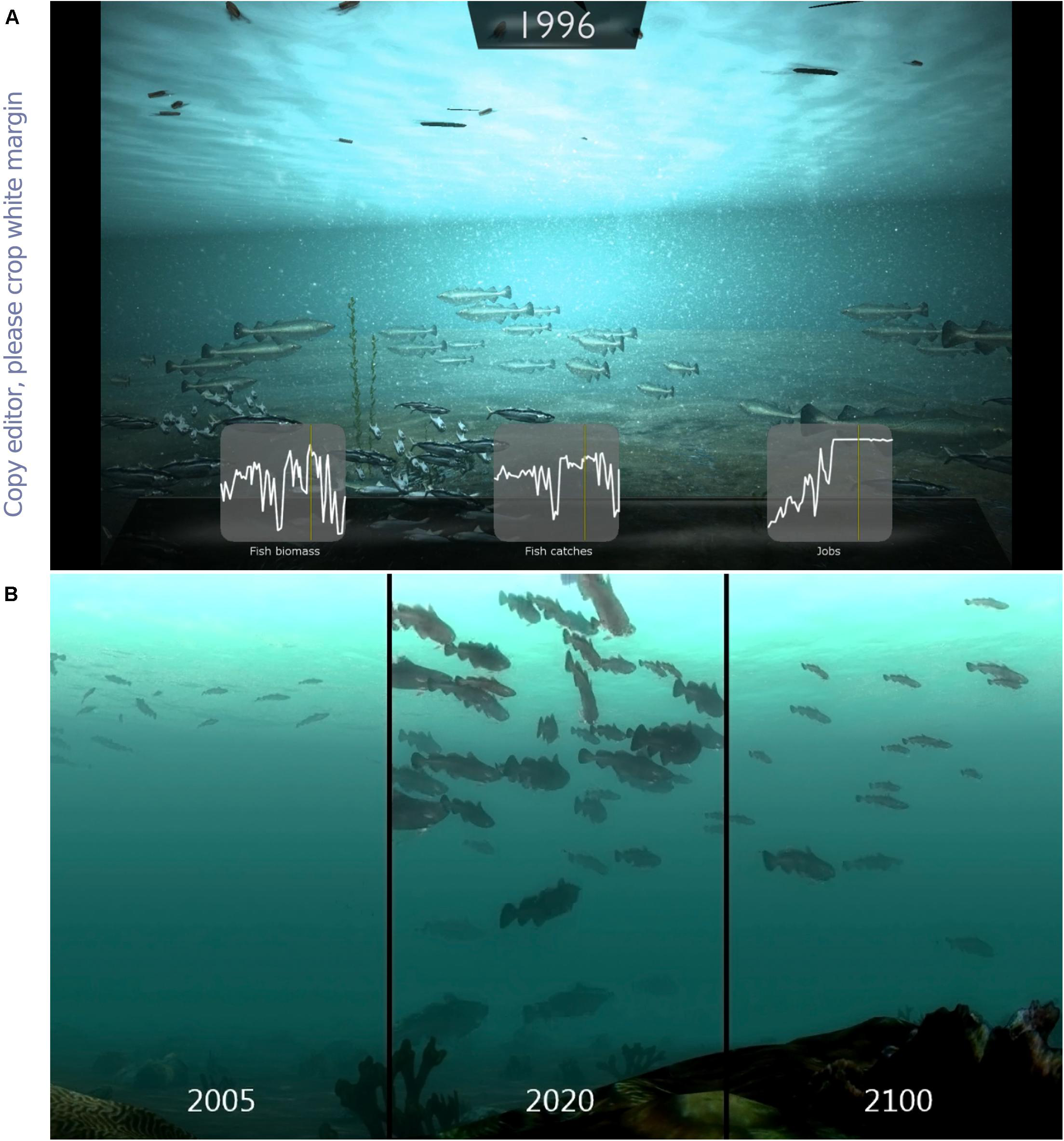 Communicating changes over time through animations is challenging due to the shifting baseline effect (Pauly, 1995; Soga and Gaston, 2018). Early versions of OceanViz had a timeline system that stepped through simulation time at 1 month per second, where species population changed according to their abundance while the animation progressed (Figure 6A). However, at the end of an animation of progressive change over 50 years, it was hard to recall the initial state of the ecosystem. It was thus very difficult to make any form of comparison between the initial and final states of an ecosystem simulation. We addressed this issue by visualizing the environment across three panels – three time slices – in a continuous camera (Figure 6B). The panels represent the first, mid-point, and last year of a simulation, where each panel displays animal densities, sizes and environment conditions (e.g., turbidity) according to the ecosystem model. This three-panel setup allows for side-by-side visual comparison of the amount of change in an ecosystem. The panels could also reflect the end-of-simulation year for different management scenarios to allow for a side-by-side visual comparison of fisheries management impacts.