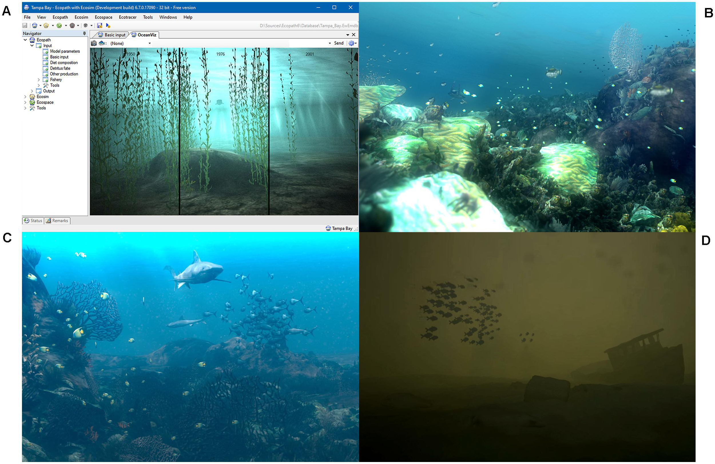 Different uses of the OceanViz visualizations: embedded in the EwE desktop software (A), in a scripted movie to show the impacts of sharks on coral reefs (B), in a scripted movie shows the ecological links between sharks, tuna, and sea birds (C), in a kiosk game that allowed users to explore the combined impacts of eutrophication and fishing in the Baltic (D).