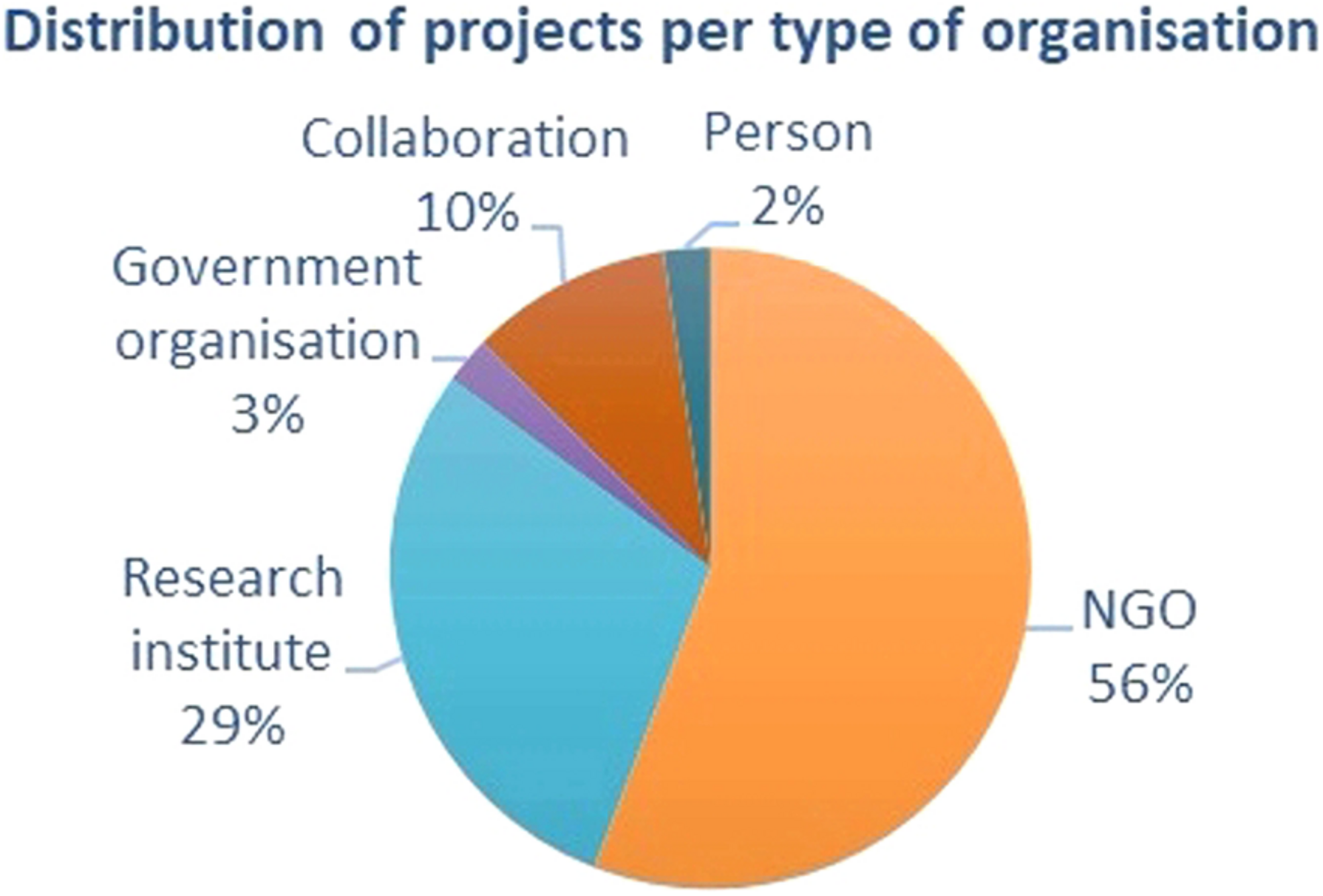 North Sea Citizen Science projects are enabled by a wide-ranging group of stakeholders (charities and foundations, governmental organisations, research institutes, partnerships, individual people). NGOs are the main contributors to North Sea CS-initiatives (56%; see Figure 3), followed by research institutes (29%). The same two groups are taking the lead in France and Norway though in very different proportions (France: NGOs 85%; Norway: R.I. 88%). Often, there is collaboration between these two stakeholders in one or more stages of the projects. Only a small number (15%) of the North Sea projects is being coordinated by a collaborative effort, through government organisations or by individuals. NGOs as well as research institutes have a focus on species-specific research (55%). Governmental organisations focus on pollution related topics and species research.
