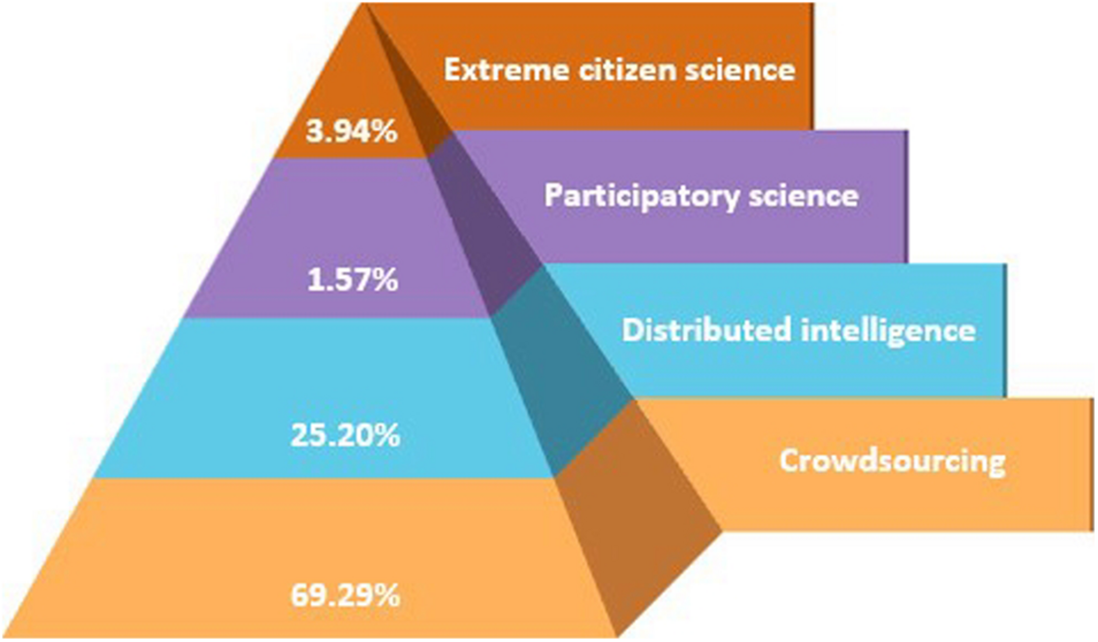 Shum et al. (2012) and Haklay (2013) define four types of programmes in terms of the participation that is needed. “Crowdsourcing” requires the lowest level of participation. No knowledge on the subject is required, and citizens act merely as sensors often in the form of reporting observations “Distributed intelligence” requires more effort and a certain level of knowledge from the citizen scientist. “Participatory science” involves citizens in defining the problem, composing a method, and in data collection, while “extreme citizen science” pushes participants to interact in all the research steps, including data analysis. The level of participation obviously determines the number of existing projects. In the North Sea study (Figure 4), crowdsourcing is most frequent (69%), followed by distributed intelligence (25%). Two projects explored participatory science, and only five projects reached the most interactive level of extreme citizen science. This is in accordance with the expectations, as demonstrated with the citizen science pyramid: the higher the level of participation, the more effort needed from the citizen scientists (and from the organisers) and the less projects are found. The lowest level of involvement – crowdsourcing – requires least effort or knowledge in order to participate and therefore is most successful in terms of number of projects and participants.