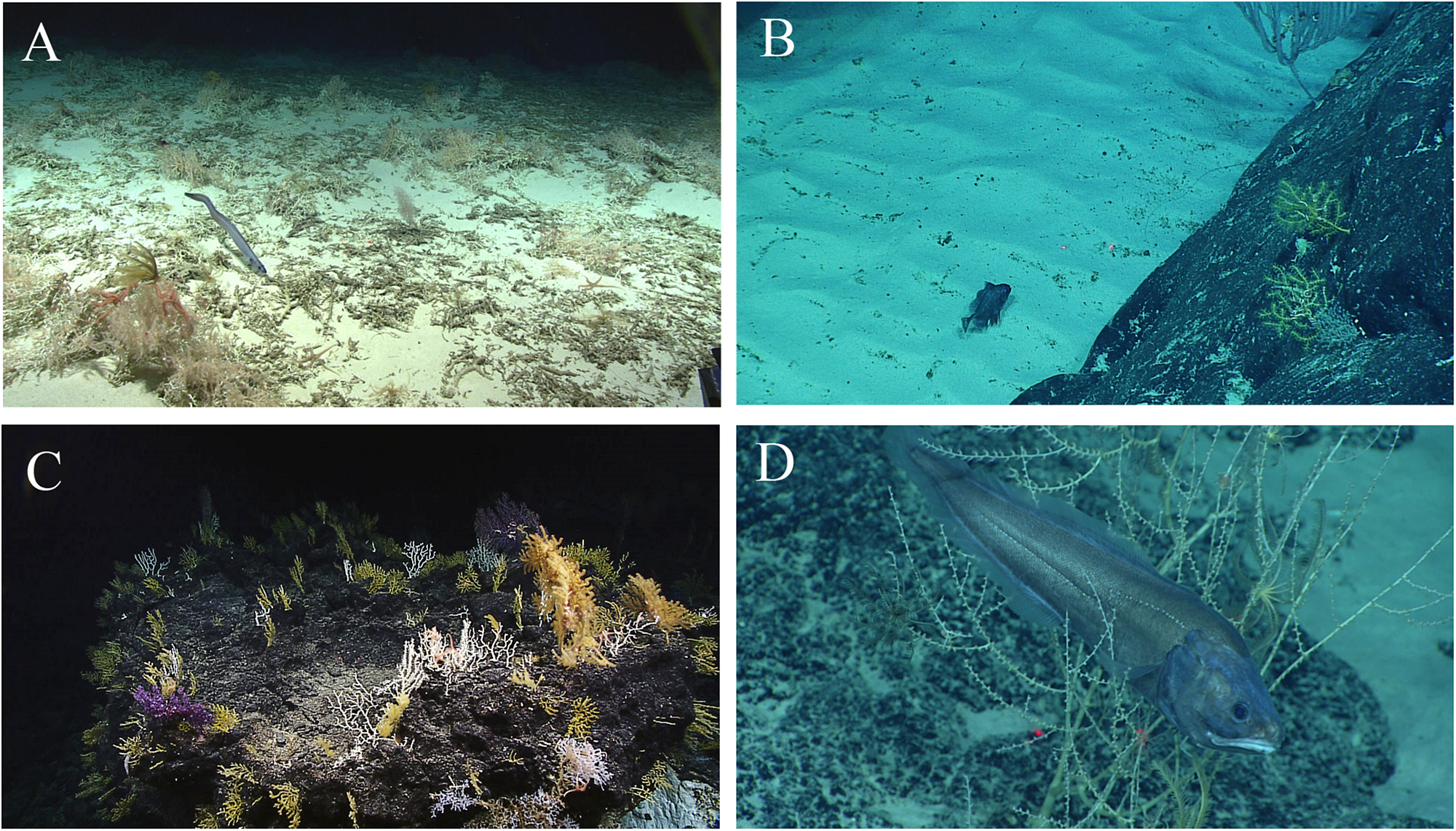 Typical communities commonly seen on Pacific seamounts that exhibit a diversity of species in different settings with no single indicator species that would characterize these places. (A) A mixed coral, coral rubble, and sand habitat at 803 m off Jarvis Island with roaming Bathycongrus. (B) Sparse corals and Neocyttus cf. acanthorhynchus along the margin of basaltic ridge and sand habitats, 1,140 m, Titov Seamount. (C) A mixed coral community on the flank of Swordfish Seamount, 970 m. (D)Diplacanthopoma sp. among octocoral branches in a mixed basalt and sand habitat. All images courtesy of NOAA Okeanos Program and CAPSTONE Science Team, fish identifications from annotations during the dives by B. Mundy, NOAA Fisheries.