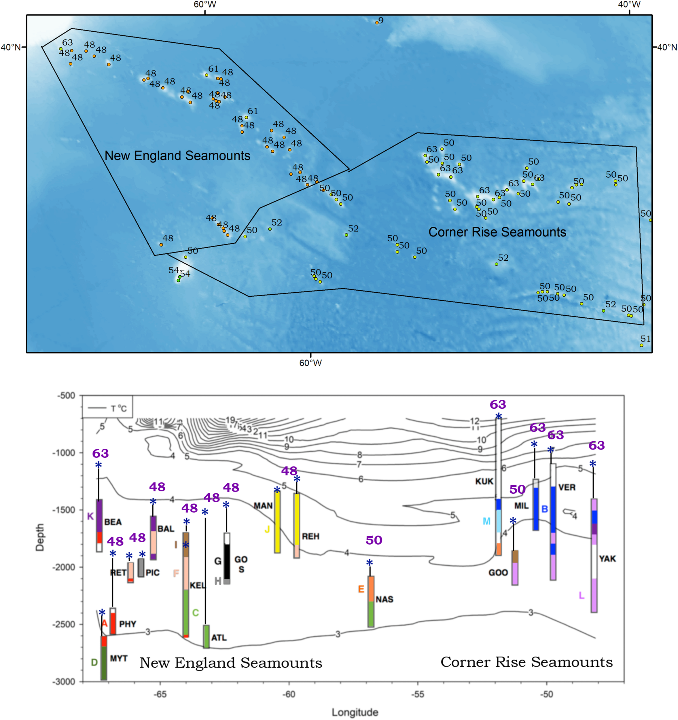 Application of the Clark et al. (2011) seamount classification system to the seamounts of the New England and Corner Rise seamount groups, NW Atlantic whose summits were shallower than 3,500 m. Top panel: Numbers indicate in which group the seamount was included. Seamount groups were distinguished globally using factors such as summit depth, organic matter flux to the seamount summit, temperature at the summit, etc. Lower panel: A chart showing the arrangement of megafaunal assembles on the flanks of the seamounts from the upper panel that were surveyed by submersible or ROV (modified from Lapointe et al., 2020). Colors represent distinct megafaunal assemblages (white indicates areas not surveyed), asterisks indicate summit depths, numbers above the asterisks are the classification group from Clark et al. (2011), and the three letter acronyms represent seamount names (see Lapointe et al., 2020 for details).