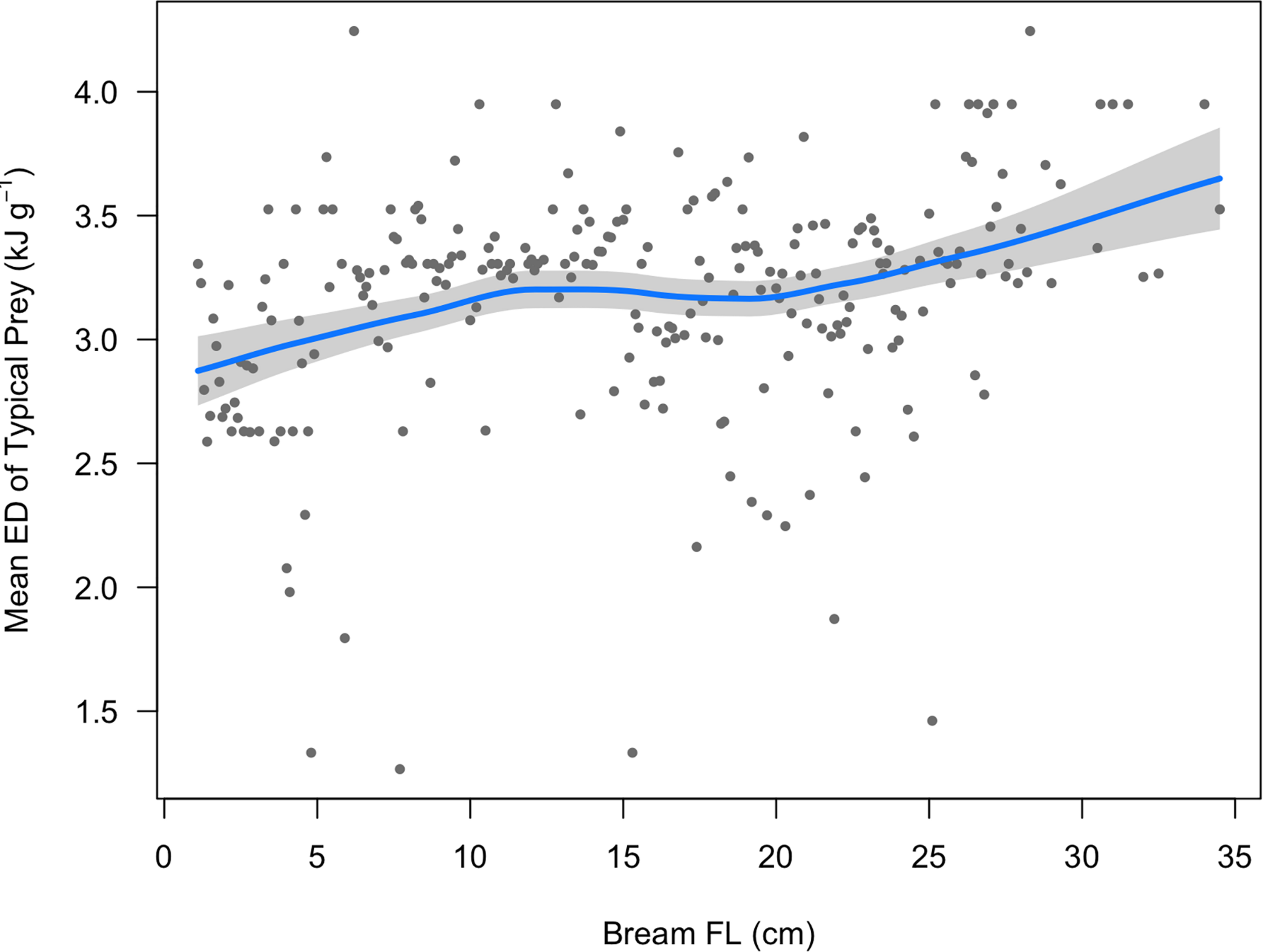 The mean energy density of prey typically consumed by Yellowfin Bream (ED, n = 1,130 bream stomach contents) of sizes sampled in this study, in 1 mm bins. The solid blue line is the fitted LOESS curve (smoothing parameter = 0.75). The shaded area depicts the 95% confidence band.