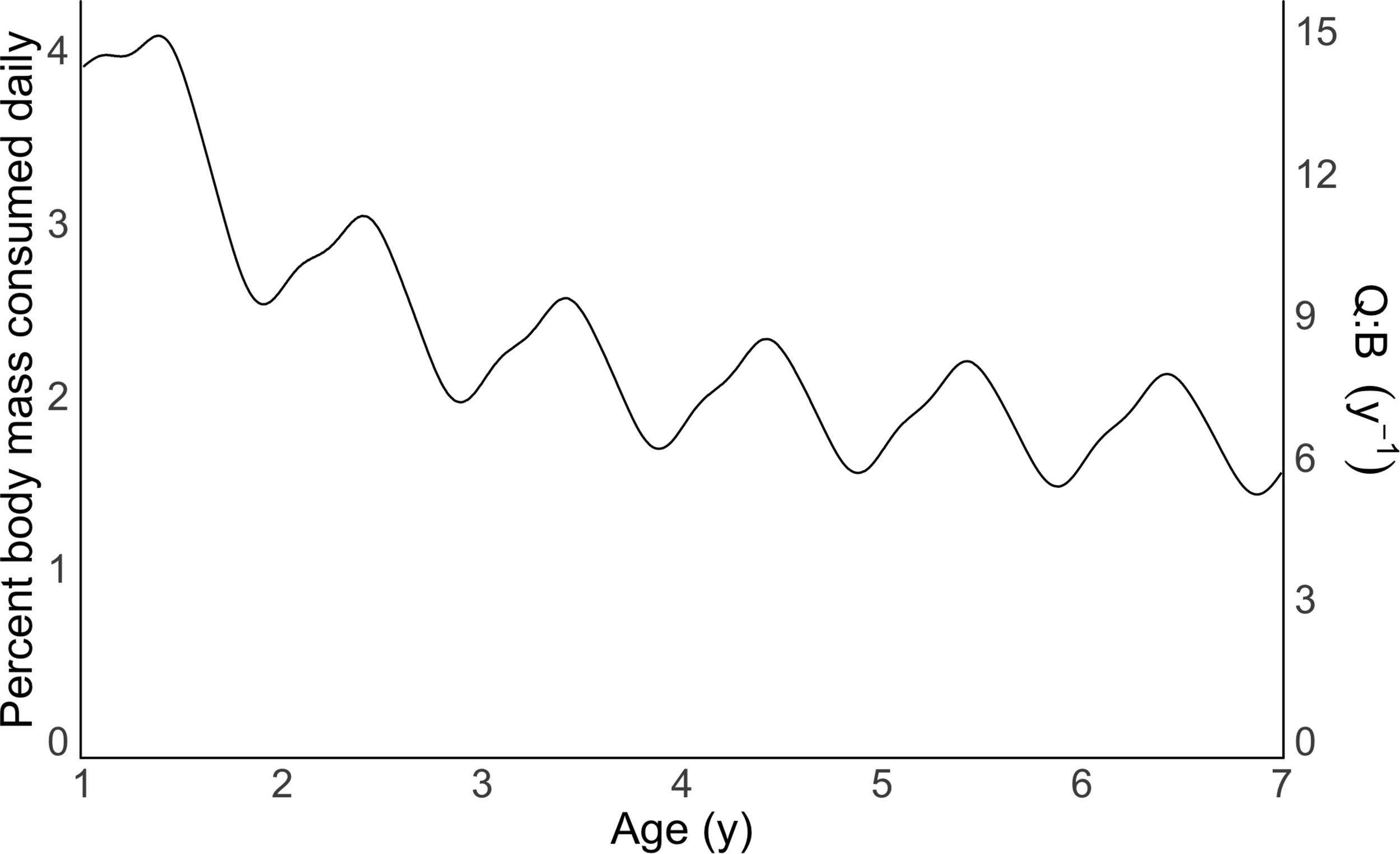 The bioenergetic model showed mass-specific consumption rate was higher in younger individuals. A one-year old individual (14.5 cm FL) consumed 3.90% of its body weight daily, with a Q:B of 14.25, whereas a seven-year old adult (28.8 cm FL) consumed 1.42–2.12% (mean 1.79%) of its body weight daily, with a Q:B of 5.21–7.75 (mean 6.52; Figure 3). Oscillations in predicted consumption rate estimates were caused by seasonal fluctuations in water temperature and its subsequent impact on RMR (Figure 3).