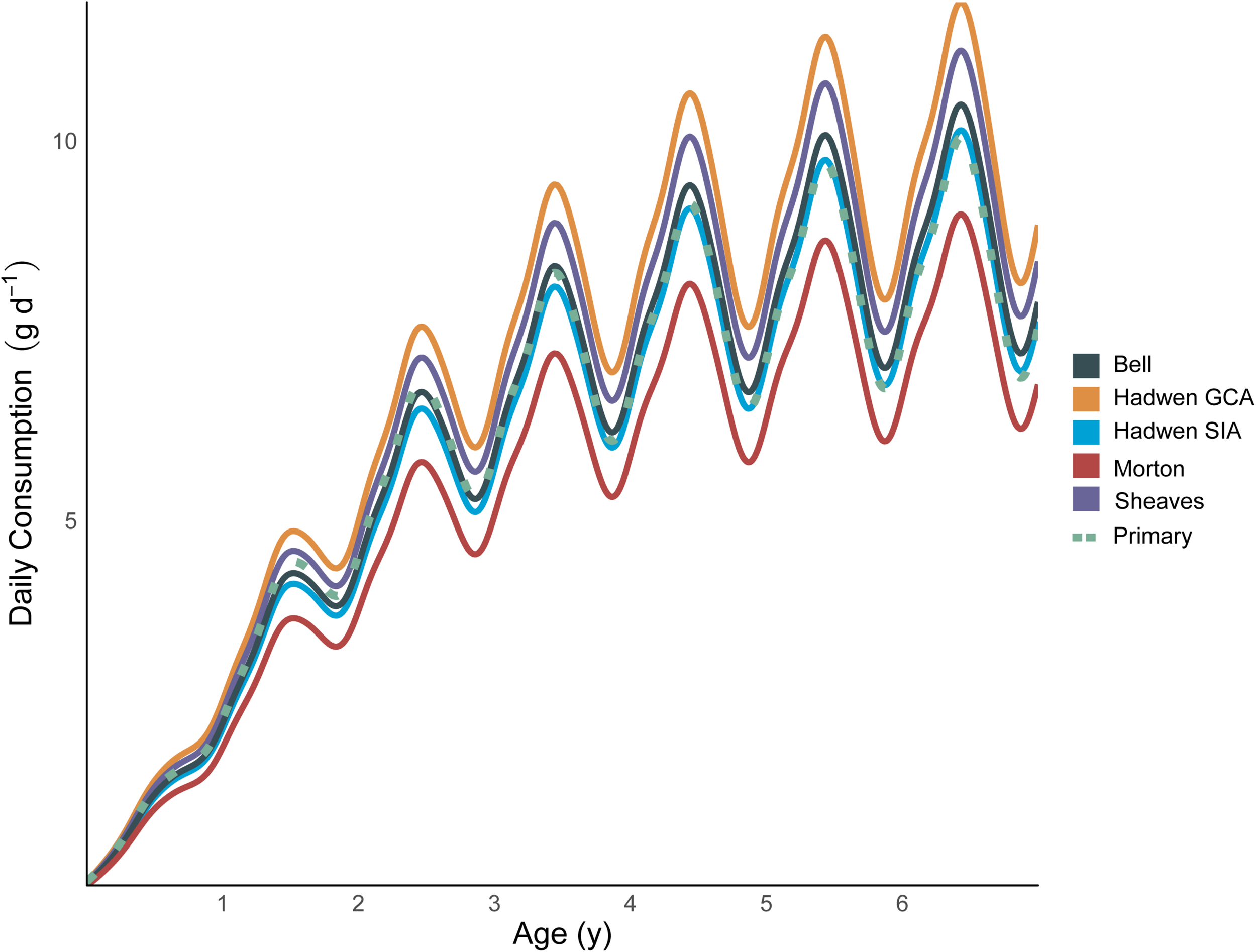 The comparative scenarios that used prey compositions derived from the literature estimated lifetime consumption (g) of Bream between 24.9% lower (Morton—Autumn) and 14.7% higher (Hadwen GCA) than the primary model presented here (maximum difference 52.7%, range 11.7–17.8 kg; Table 3). The daily consumption rate (g day–1) for the scenario with the highest consumption rate (Hadwen GCA) was up to 53% higher than the scenario with the lowest consumption rate (Morton Autumn; 7.7–11.8 g day–1; Figure 4).