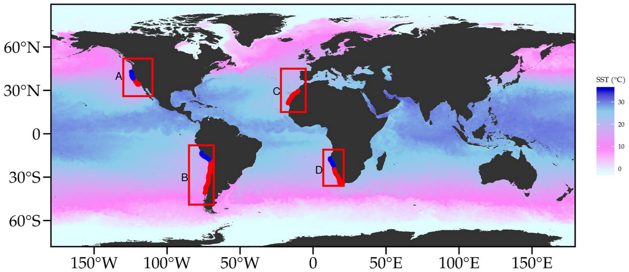 OISST throughout the global ocean. The red colored rectangles delimit EBUS: (A) California (CCS), (B) Humboldt (HCS), (C) Canary (CnCS), and (D) Benguela (BCS) current systems. Two upwelling systems were analyzed along the Eastern Atlantic Ocean, these are the (A) Benguela (South 30.13–23.26°S; North 20.76–16.39°S) and Canary (18.89–32.63°N). Two upwelling systems were assessed in the Eastern Pacific Ocean, including the Humboldt Current (HCS: Chile 37.62–28.88°S, Peru 16.39–10.15°S) and California Current (CCS: South 33.88–36.06°N, North 37.94–42.31°N).