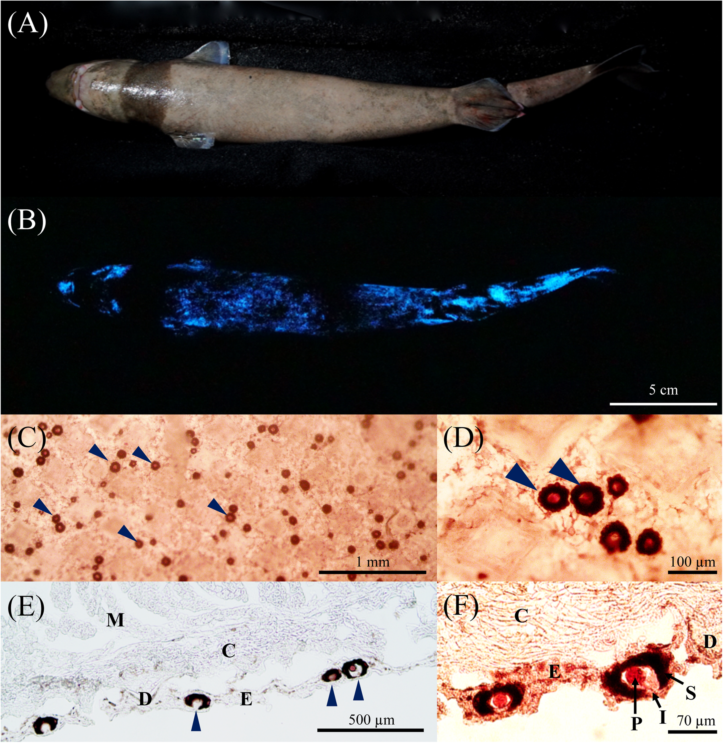Bioluminescence of Isistius brasiliensis. (A)Ventral side of I. brasiliensis. The dark-collar or black band is visible on the anterior part. (B) The ventral luminous pattern observed on the ventral side. An absence of bioluminescence is observed on the dark collar. The dark region in the middle of the shark is artifactual and corresponds to the area where the specimen was stabilized for the picture. (C,D)In vivo observation of the photophores present on the ventral skin region. (E,F) Observation of the photophores using classical histology. Arrows indicate the epidermal photophores. Legend, C, connective tissue; D, dermal denticle; E, epidermis; M, muscles; I, iris-like structure; P, photocyte; S, pigmented sheath.