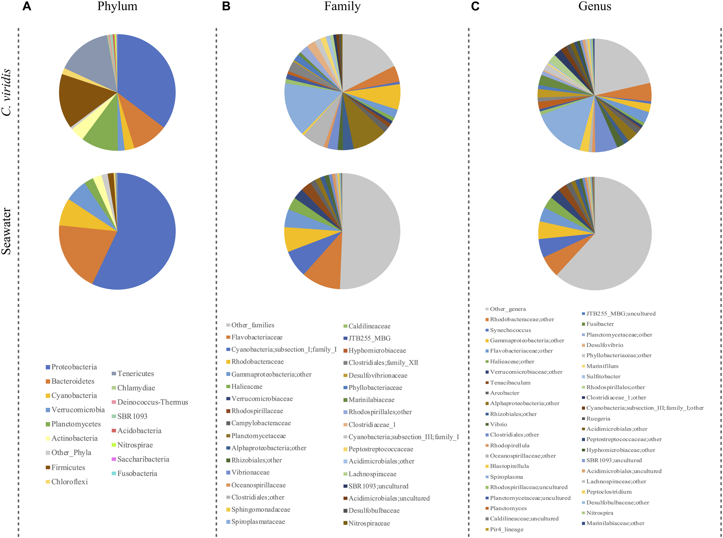 Microbiota compositionof C. viridis and seawater. Pie charts summarizing the phylum (A), family (B) and genus-level (C) microbiota composition of C. viridis and seawater. Only phyla with relative abundance >0.5% in at least 10% of samples, and families and genera with relative abundance >2% in at least 10% of samples are represented.