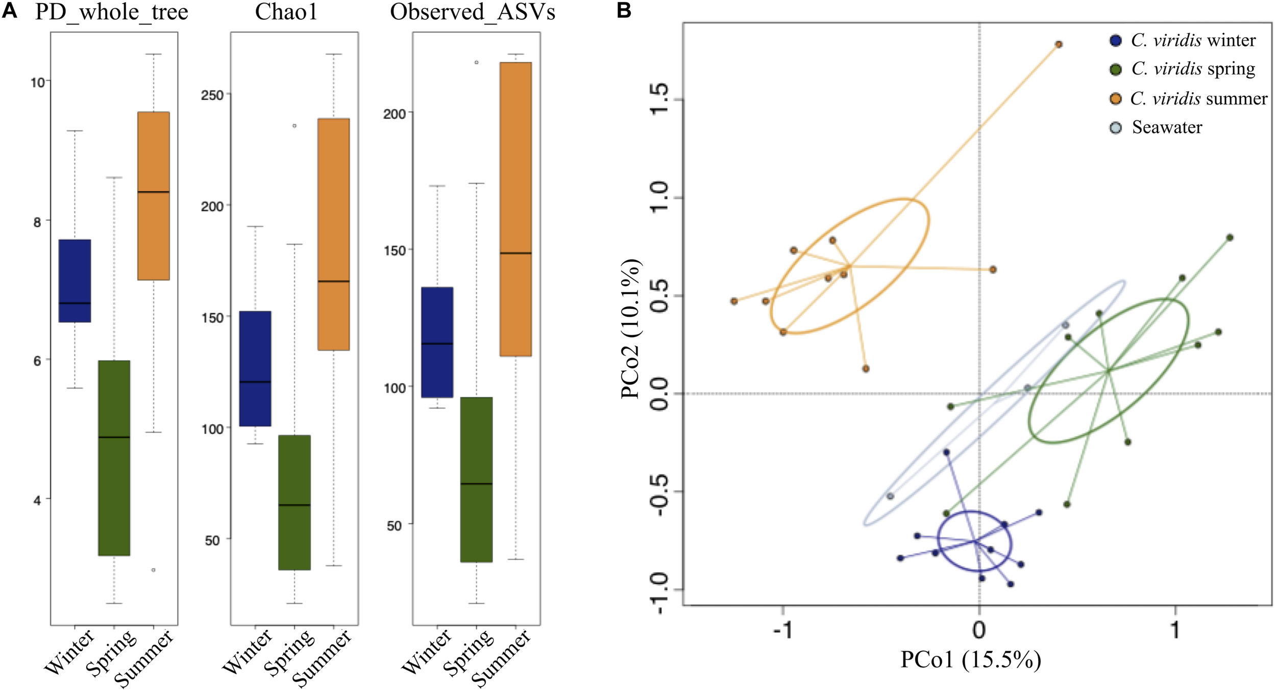 Alpha and beta diversity of the C. viridis microbiota. (A) Box-and-whisker distribution of the Faith’s Phylogenetic Diversity (PD_whole_tree), Chao1 index for microbial richness and number of observed ASVs, calculated for winter (dark blue), spring (dark green) and summer (orange) anemone samples. According to all metrics, greater microbial diversity was observed in winter and summer than in spring (Kruskal–Wallis test controlled for multiple testing using FDR, p-value ≤ 0.05). (B) Principal Coordinates Analysis (PCoA) based on unweighted UniFrac distances showing the variation of the anemone microbiota across seasons (same color code as in A) and seawater samples (light blue) (permutation test with pseudo F-ratio, p-value ≤ 0.001). The first and second principal components (PCo1 and PCo2) are plotted and the percentage of variance in the dataset explained by each axis is reported. Ellipses include 95% confidence area based on the standard error of the weighted average of sample coordinates.