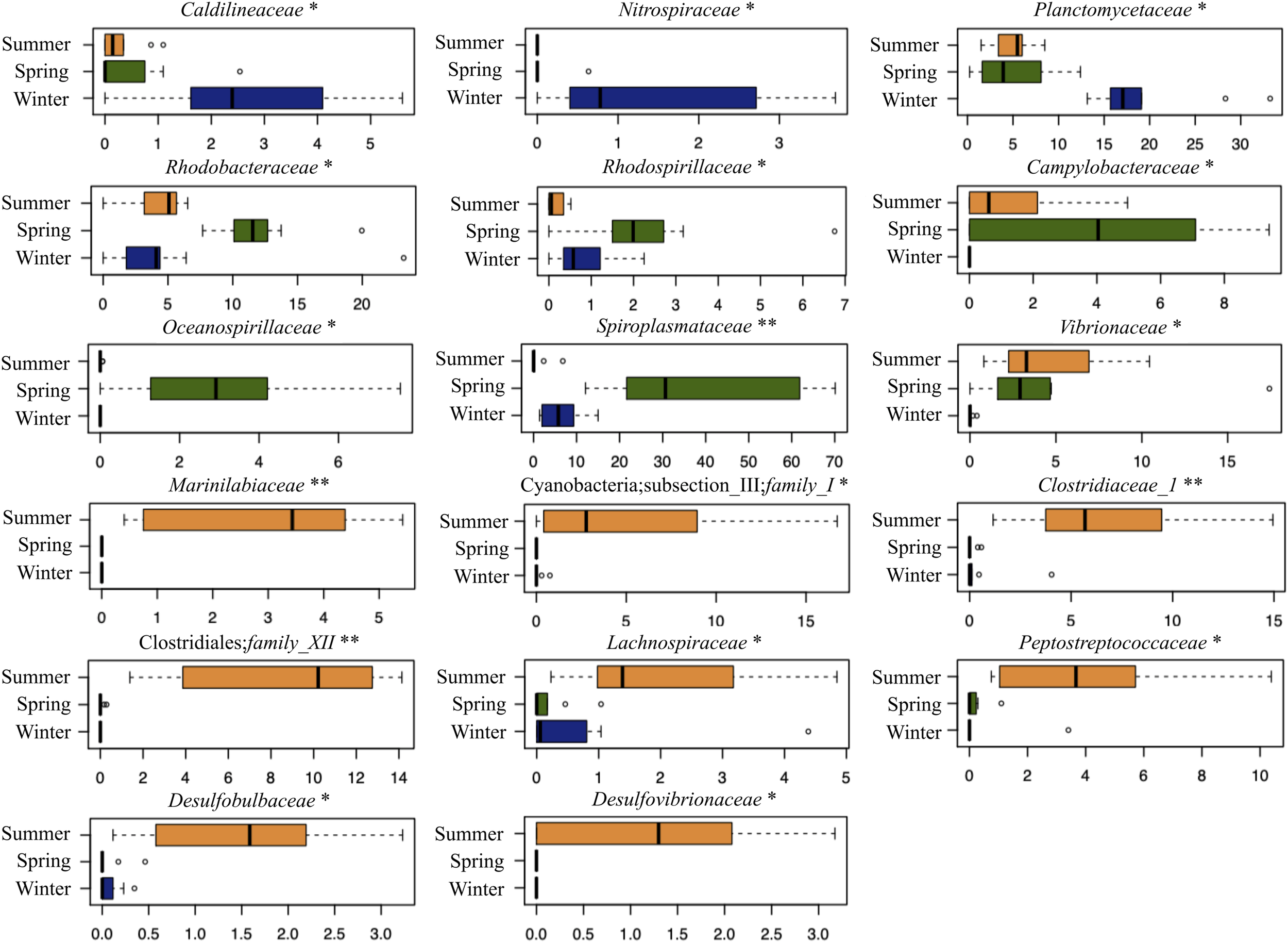 C. viridis-associated bacterial families differently represented across seasons. Box-and-whisker plots showing the relative abundance distribution of bacterial families in the different seasons (winter, dark blue; spring, dark green; and summer, orange). The central box represents the distance between the 25th and 75th percentiles. The median is marked with a black line. Whiskers identify the 10th and 90th percentiles. ∗p-value ≤ 0.05; ∗∗p-value ≤ 0.01; Kruskal–Wallis test controlled for multiple testing using FDR.