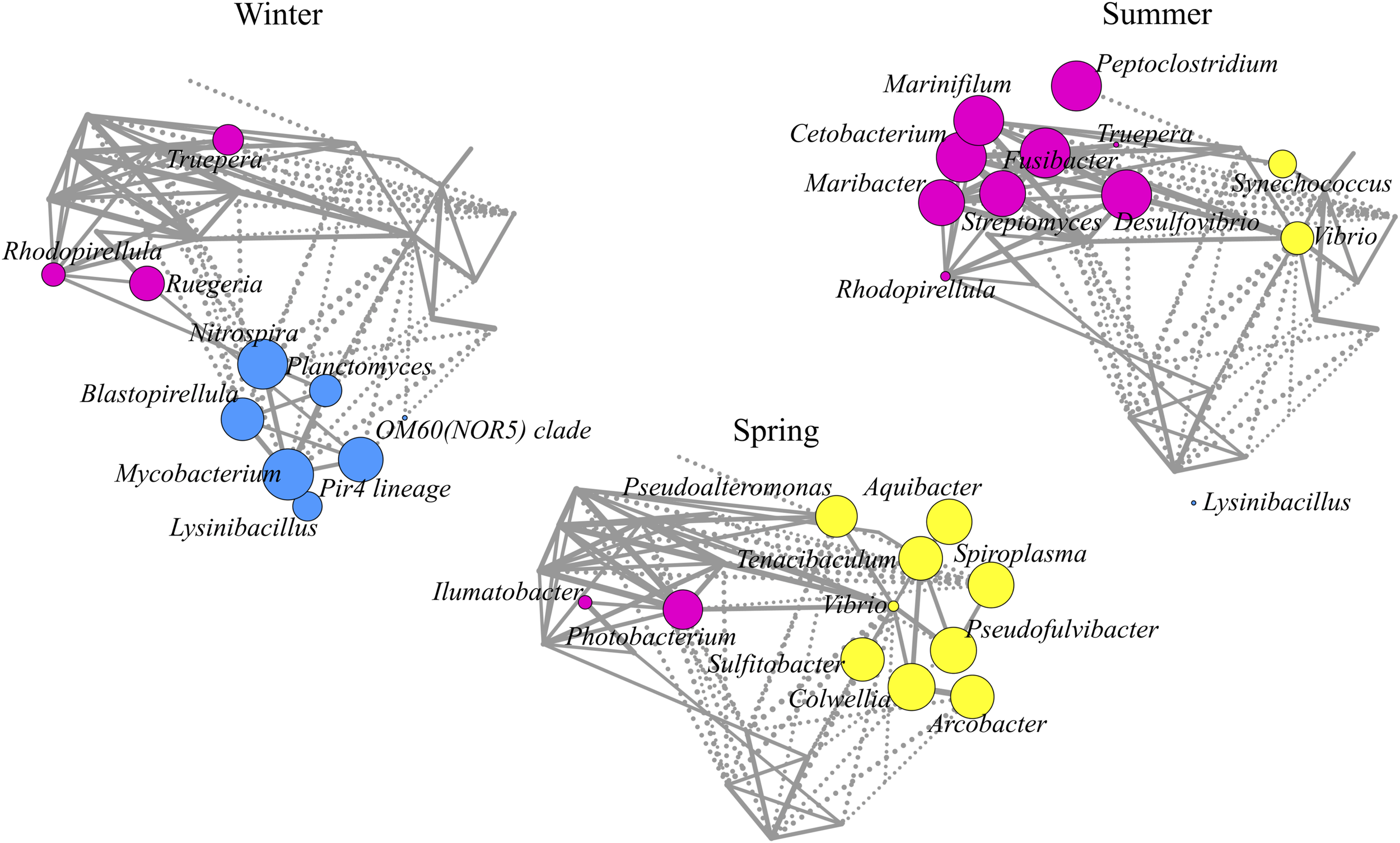 Declination of C. viridis co-abundance groups according to seasonality. Co-abundance groups (CAGs) are named according to the dominant genus in each group: Mycobacterium, Colwellia, and Desulfovibrio. Each node represents a bacterial genus and its size is proportional to its overabundance on the average value within the population. The connections between nodes represent positive (solid lines) and negative (dashed lines) Kendall correlations between genera (FDR ≤ 0.05).