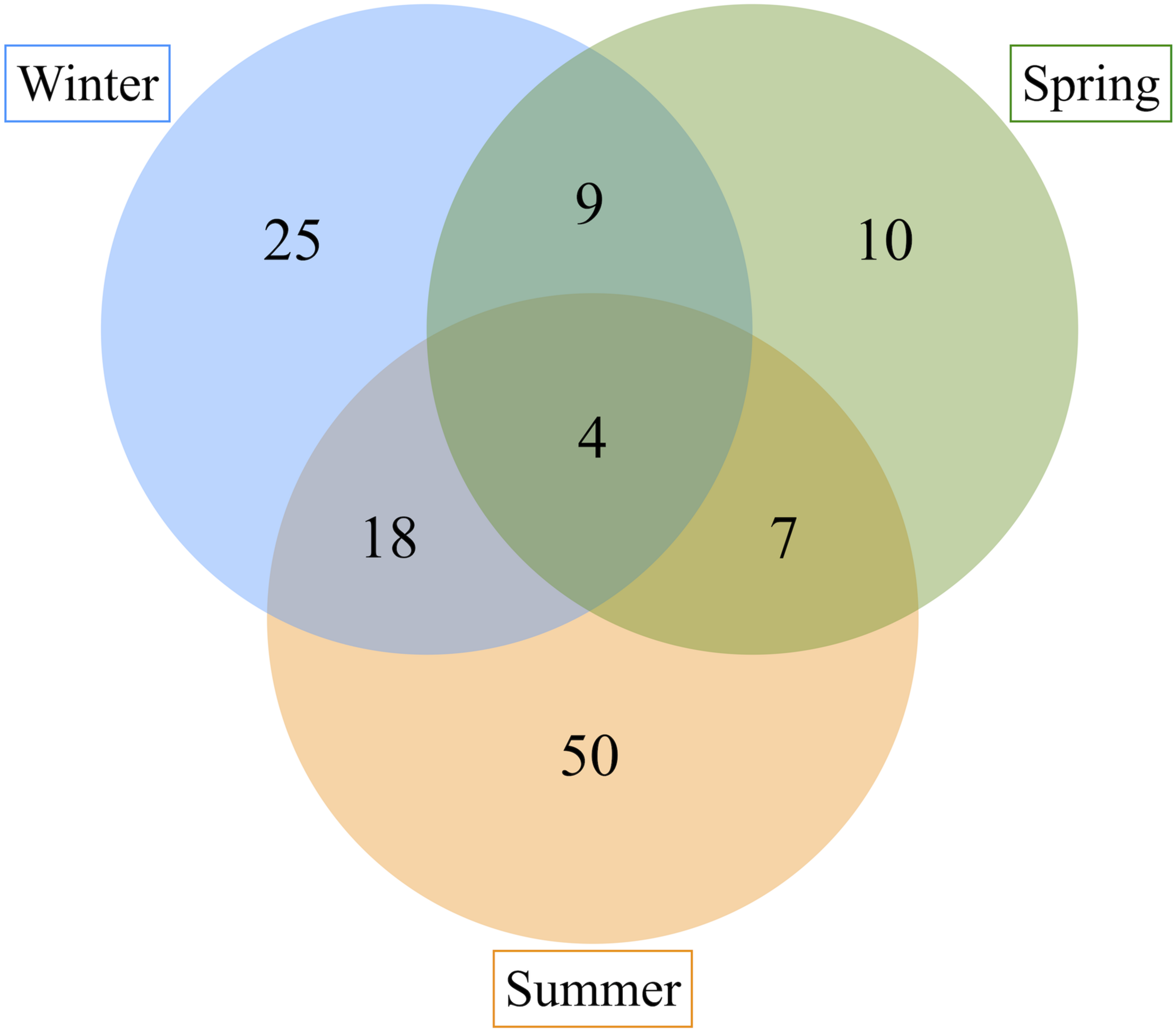 ASVs sharing among C. viridis-associated microbial communities in winter, spring, and summer.