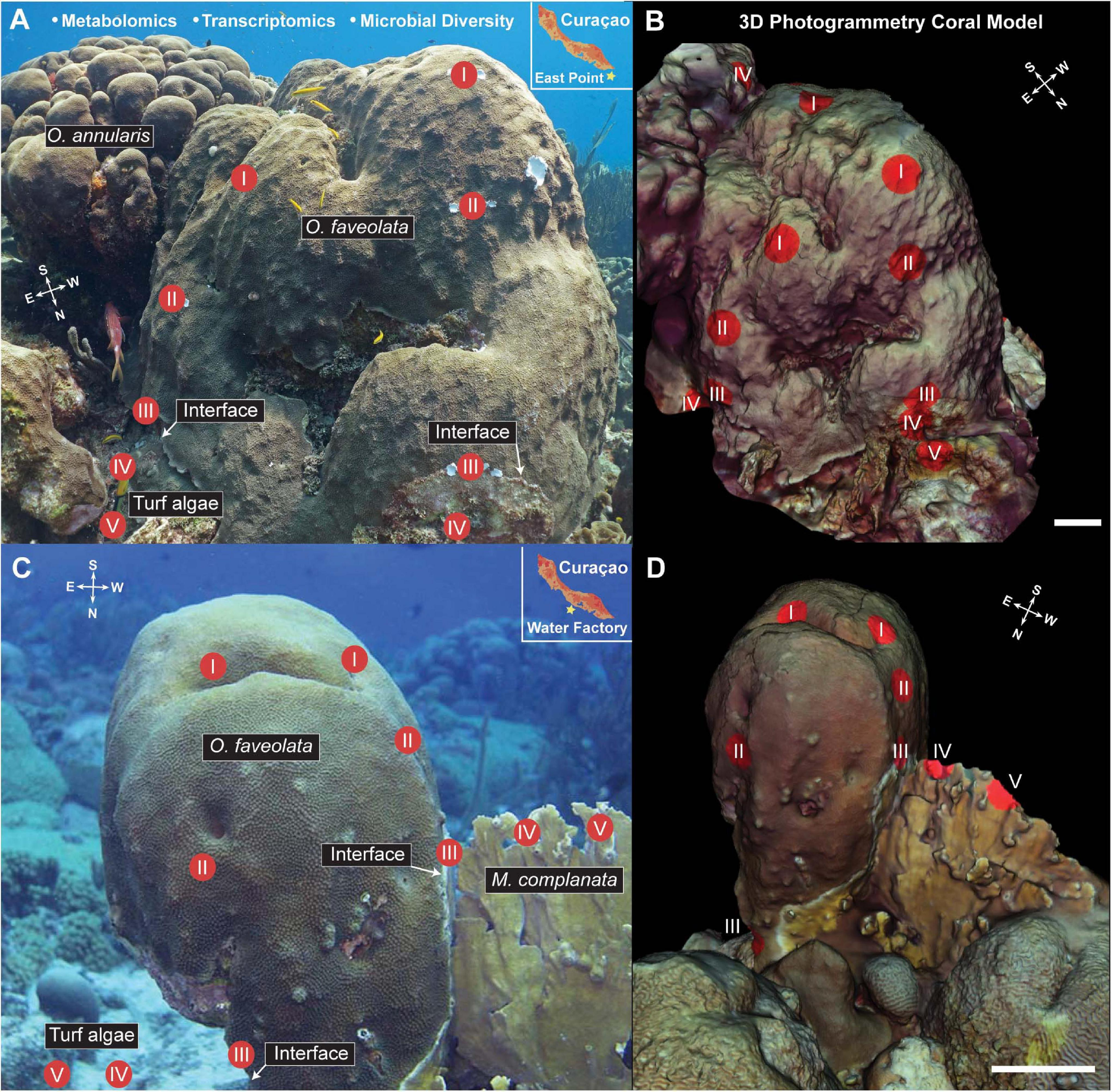 Images (A,C) and 3D models (B,D) of the Orbicella faveolata corals with sampling points overlaid for visualization. Inset in panels (A,C) show the geographic location of the sampling efforts. Compass insets indicate the orientation of the coral colonies for cardinal direction. Three samples were taken from each sampling point (I-V), one for 16S and 18S rDNA amplicon sequencing, one for metatranscriptomic sequencing, and one for LC MS/MS metabolomic analysis for a total of 60 samples (24 coral, 12 interface, and 24 competitor) taken at each site (Water factory and East Point). Models were created using Autodesk ReCap Photo and 3D molecular mapping was performed using ili (scale bar = 20 cm). White arrows indicate the interface between O. faveolata and the interacting competitors (turf algae, Orbicella annularis, Millepora complanata).White arrows indicate the interface between O. faveolata and the interacting competitors (turf algae, Orbicella annularis, Millepora complanata).