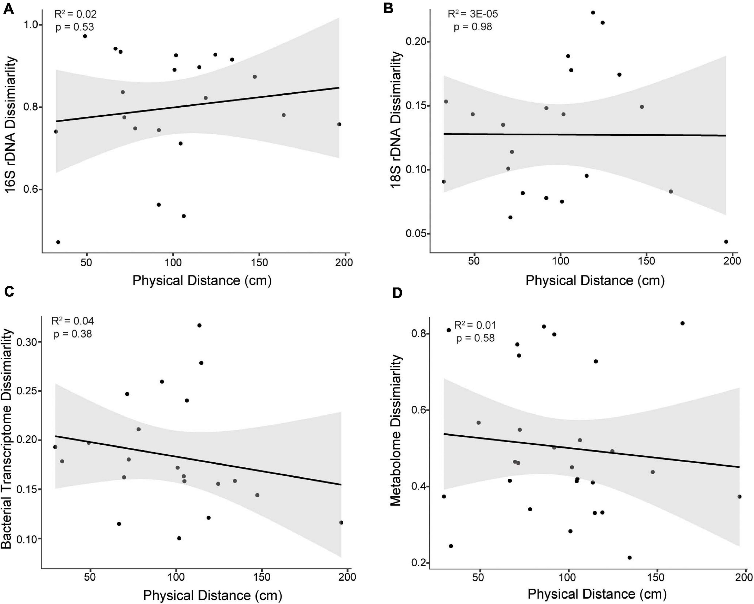 Bray-Curtis dissimilarity of (A) 16S rDNA, (B) 18S rDNA, (C) bacterial transcriptomes, and (D) metabolomes as a function of the physical distance between samples of the East Point Orbicella faveolata colony. The physical distance represents the shortest distance between two sample points along the 3D coral model surface. No significant correlations were observed (p > 0.05) and similar results were found for the Water Factory O. faveolata colony. Black lines represent the fit line and gray areas represent the fit confidence (95%).