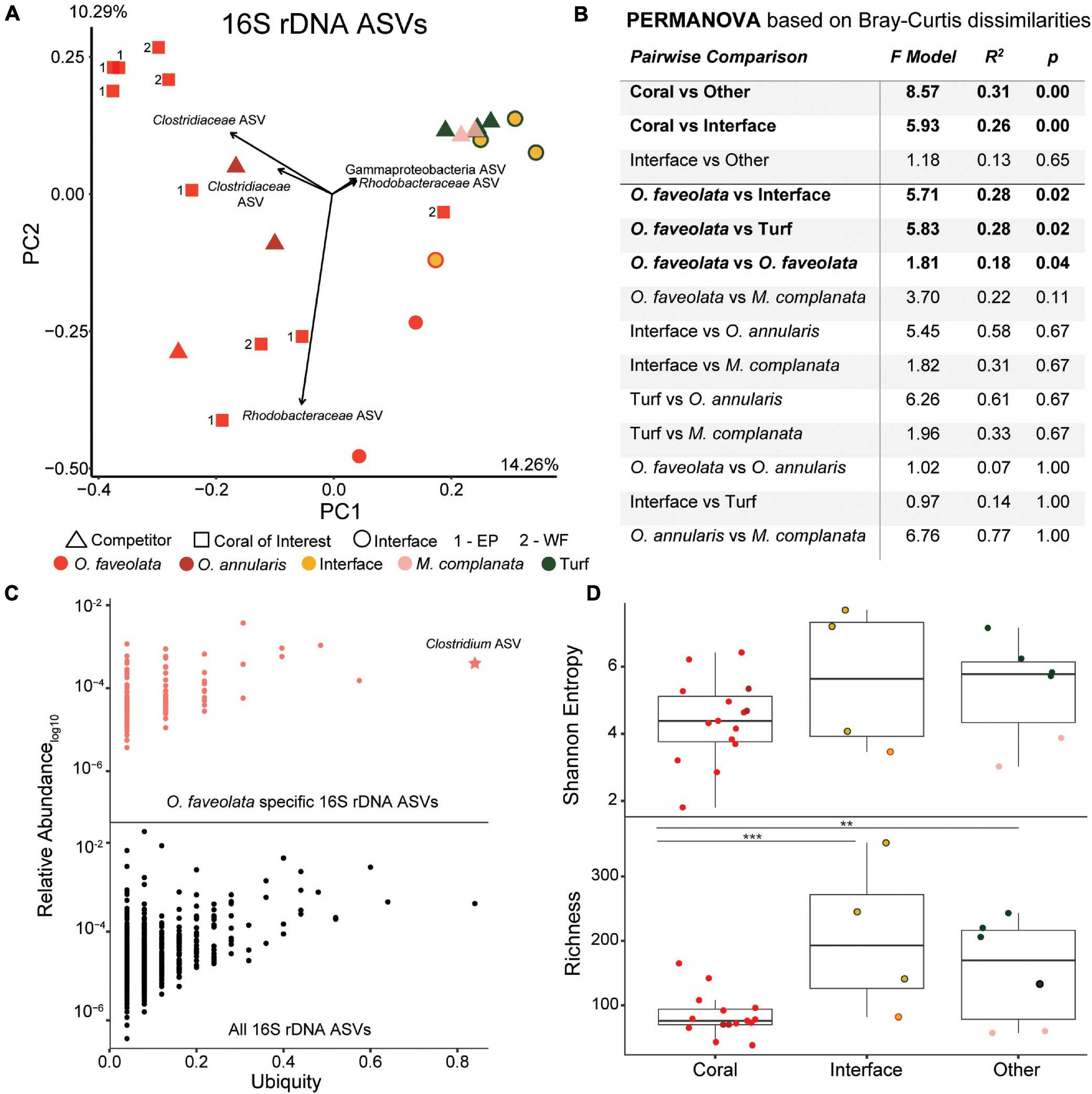 Overview of the 16S rDNA amplicon data. (A) Principal components plot of the 16S rDNA ASVs from the coral colonies of interest along with interfaces and their respective benthic competitors. EP, East Point coral of interest; WF, Water Factory coral of interest. (B) PERMANOVA results based on Bray-Curtis dissimilarities. (C) Relative abundance (proportion of the entire community) versus ubiquity of each ASV from all samples (bottom plot) and those unique to O. faveolata samples (top plot). Ubiquity for unique O. faveolata ASVs is normalized to total O. faveolata samples. The star represents the most ubiquitous ASV found only in O. faveolata (i.e., a taxa that is uniquely ubiquitous in O. faveolata). (D) Diversity metrics of coral, interface and other (turf algae and M. complanata) samples. Interface and other samples had significantly higher bacterial richness than coral samples (** p ≤ 0.01, *** p ≤ 0.001).
