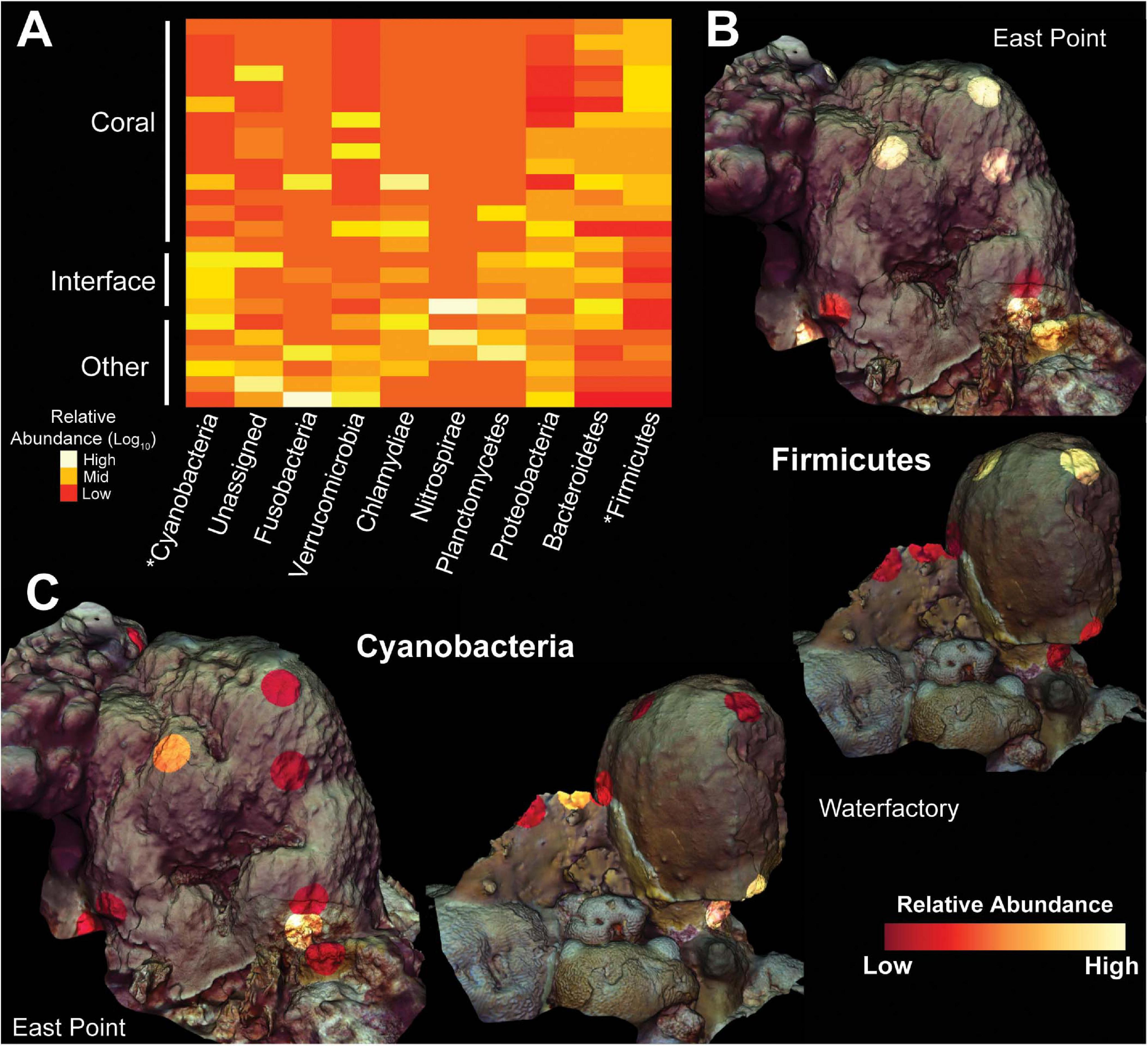 Heatmap and 3D cartography of bacterial phyla from Orbicella faveolata colonies, competitors and interfaces. (A) Heatmap of phyla selected from the supervised random forests analysis. Relative abundances are log-transformed and colors are normalized to columns with red representing the lowest relative abundance and white representing the highest. Asterisks highlight phyla shown in 3D models. 3D coral models mapped with the relative abundances of (B) Firmicutes and (C) Cyanobacteria from both sampling sites. The relative abundance of Firmicutes ranges from 0.21–93.5% at East Point and 0.0–89.7% at Water Factory. For Cyanobacteria, the relative abundance ranges from 0.0–14.4% at East Point and 0.0–0.49% at Water Factory.