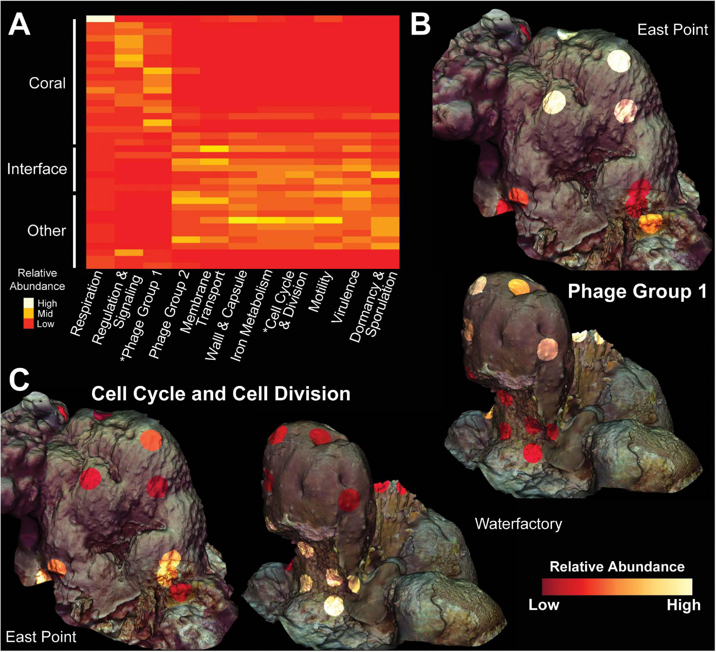 Molecular heatmap of bacterial metatranscriptomes from Orbicella faveolata colonies, competitors and interfaces. (A) Heatmap of SEED Level 1 categories selected from the supervised random forests analysis. Phage Group 1 includes phages, prophages and transposable elements while Phage Group 2 also includes plasmids. Colors are normalized to columns with red representing the lowest relative abundance and white representing the highest. Asterisks highlight Level 1 categories shown in 3D models. 3D coral models mapped with the relative abundance of bacterial transcripts belonging to (B) Phage Group 1 and (C) Cell Cycle and Cell Division at both sampling sites. The relative abundance of Phage Group 1 transcripts range from 0.06–0.74% at East Point and 0.002–0.42% at Water Factory. For Cell Cycle and Cell Division, the relative abundances range from 0.03–0.53% at East Point and 0.02–0.28% at Water Factory.