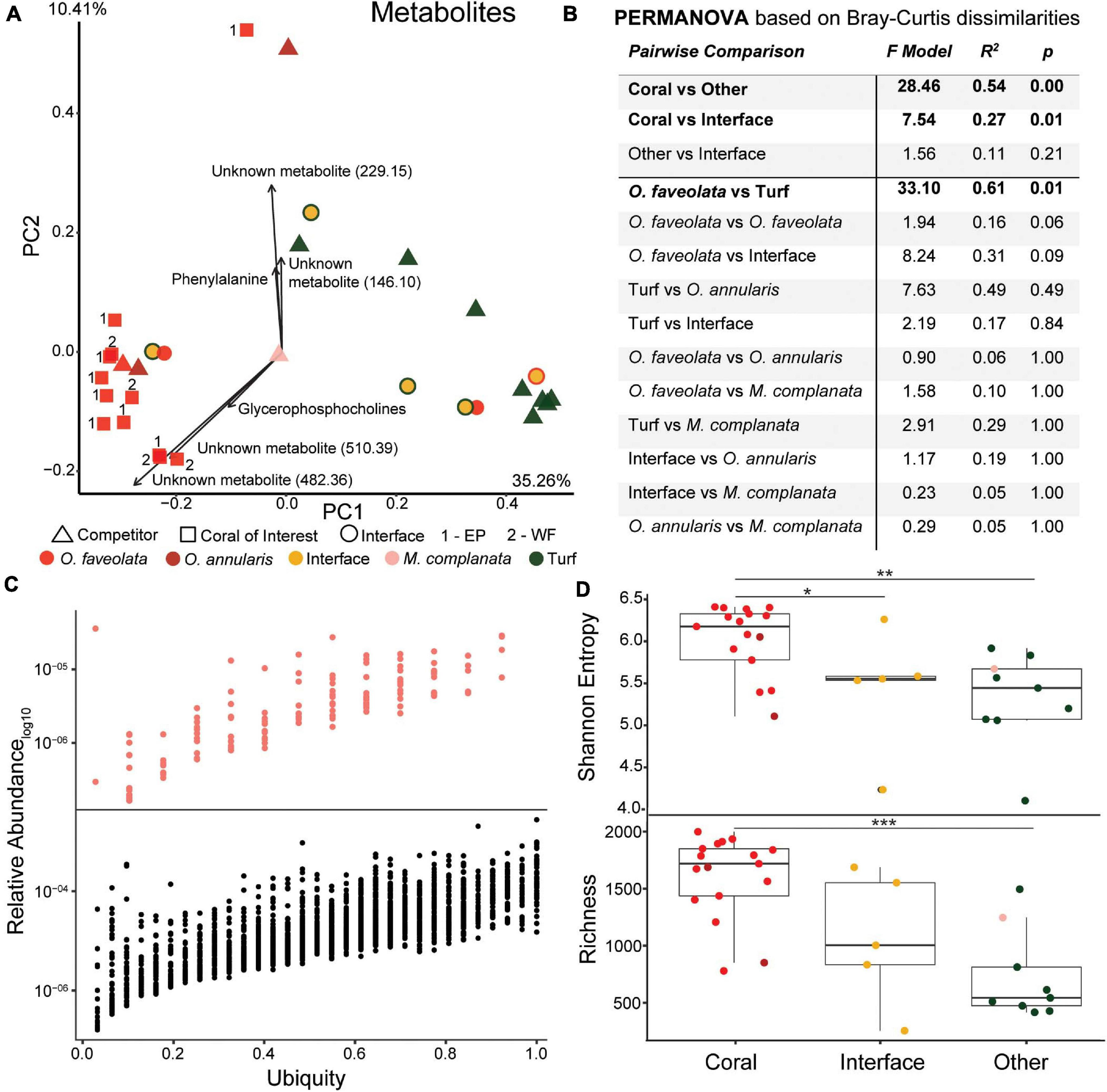 Overview of metabolome data. (A) Principal components plot of the coral colonies of interest along with interfaces and their respective benthic competitors. Main driving metabolites shown along with mass to charge ratios for unknown metabolites. EP, East Point coral of interest; WF, Water Factory coral of interest. (B) PERMANOVA results based on Bray-Curtis dissimilarities. (C) Relative abundance versus ubiquity of each metabolite from all samples (bottom plot) and those unique to Orbicella faveolata samples (top plot). Ubiquity for unique O. faveolata metabolites is normalized to total O. faveolata samples. (D) Diversity metrics of coral, interface and other (turf algae and M. complanata) samples (*p ≤ 0.05, **p ≤ 0.01, ***p ≤ 0.001).
