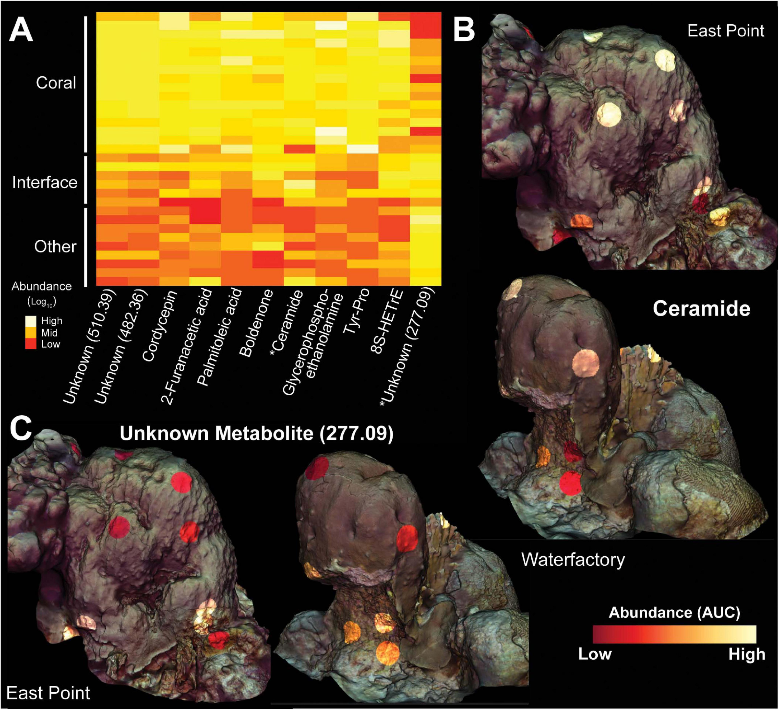 Heatmap and 3D cartography of metabolites from Orbicella faveolata colonies, competitors and interfaces. (A) Heatmap of metabolites selected from the supervised random forests analysis. Mass to charge ratios are shown for unknown metabolites. Abundances (Area Under the Curve/AUC) are log-transformed and colors are normalized to columns with red representing the lowest abundance and white representing the highest. Asterisks highlight metabolites shown in the 3D models. 3D coral models mapped with the abundances of (B) ceramide and (C) an unknown metabolite (277.09) from both sampling sites. Ceramide abundance ranges from 0-124,247 AUC at East Point and 0-69,148 AUC at Water Factory. For the unknown metabolite (277.09), the abundance ranges from 0-338,137 AUC at East Point and 0-137,151 AUC at Water Factory.