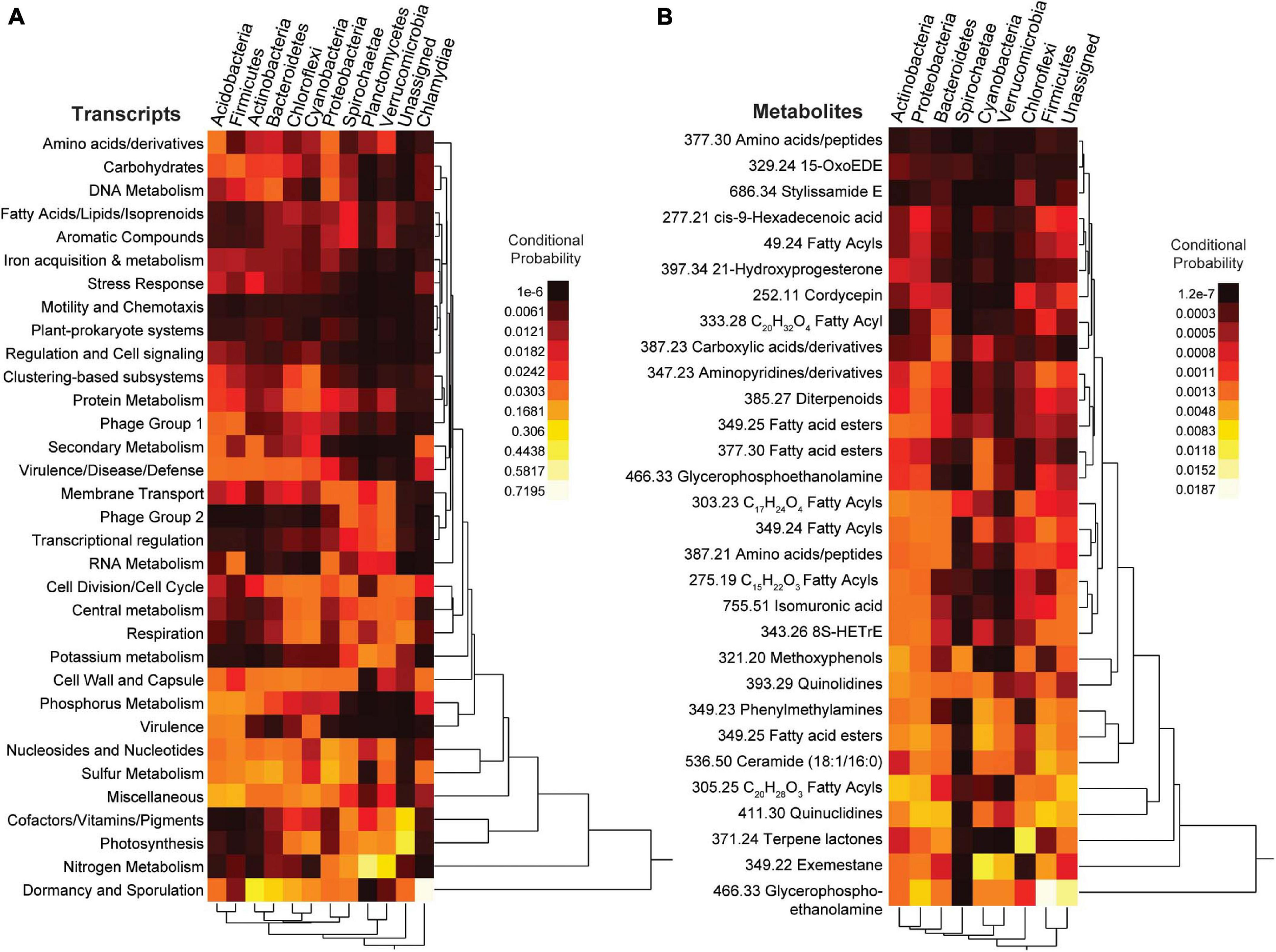 Heatmaps from the neural network (mmvec) analysis. The conditional probability (dark red/black for low and yellow/white for high) that the presence of a transcript or metabolite corresponds to the presence of a specific bacterial phylum is shown. (A) Top SEED Level 1 transcript predictors from supervised random forest analysis; (B) Top known metabolite predictors from supervised random forest analysis. For metabolites the number in front of the annotation is the mass to charge ratio.