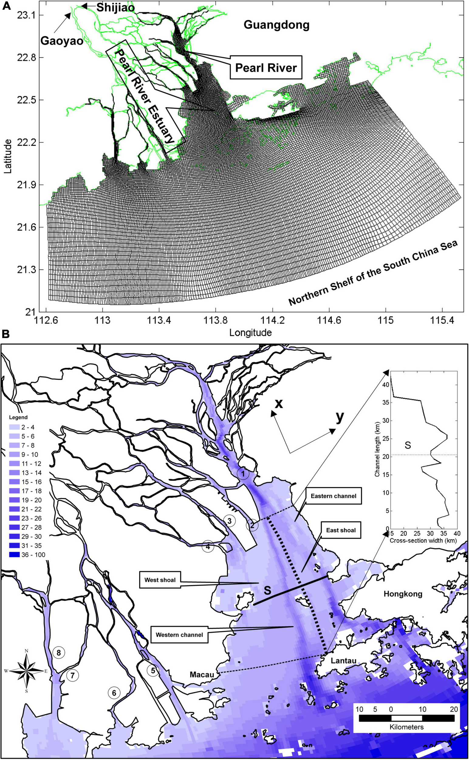(A) Model grids (black line). Green line represents the coastal line at the Pearl River Estuary (PRE) and its adjacent coastal region. Gaoyao and Shijiao are the two river flow gauge stations. (B) Bathymetry at the model region. Black line represents the coastal line at the PRE. The numbers in circles represent the mouths of the eight inlets in the PRE, ①: Humen, ②: Jiaomen, ③: Hongqimen, ④: Henmen, ⑤: Modaomen, ⑥: Jitimen, ⑦: Hutiaomen, and ⑧: Yamen. Solid lines are model sample cross-channel section S at the middle PRE. Thick dashed line represents the boundary between the western channel and eastern channel of the PRE. Thick dashed lines represent south and north boundaries of the target area in this study. The inserted image in panel (B) represents the variation of channel width (black line) from south (0 km) to north (44 km) of the target area. The dashed lines in the inserted image represent the locations of cross-channel section S. The x–y arrow in the panel (B) represents the coordinates in this study, the x-coordinate indicates the along-channel direction and points from south to north, and the y-coordinate indicates the cross-channel direction and points from west to east.