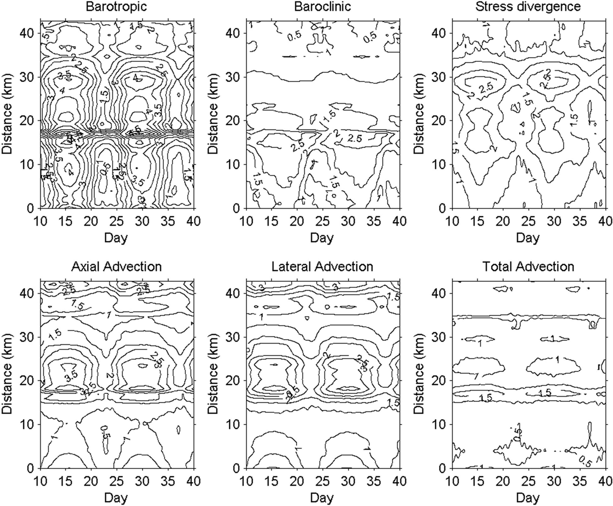 Although the absolute magnitudes of two advection terms are markedly high, the cross-sectionally averaged absolute subtidal total advection term (, the top bar indicating cross-sectional average) is much reduced, indicating that the axial and lateral advections almost balance each other in the PRE. But the magnitude of the total nonlinear advection is still comparable with the other terms (Figure 4). The fortnight variation of momentum terms of Eq. 7 are significant in which they have larger values during spring tide (e.g., days 15.5 and 30) than that during neap tide (e.g., days 23 and 37.5) along the channel except the baroclinic pressure term. The baroclinic pressure has a similar trend with other terms from the lower PRE to the low portion of the upper PRE (about 30 km), but it reverses in the remaining portion of the PRE (30–44 km) that is consistent with the along-channel salinity gradient distribution shown in Figure 3F.