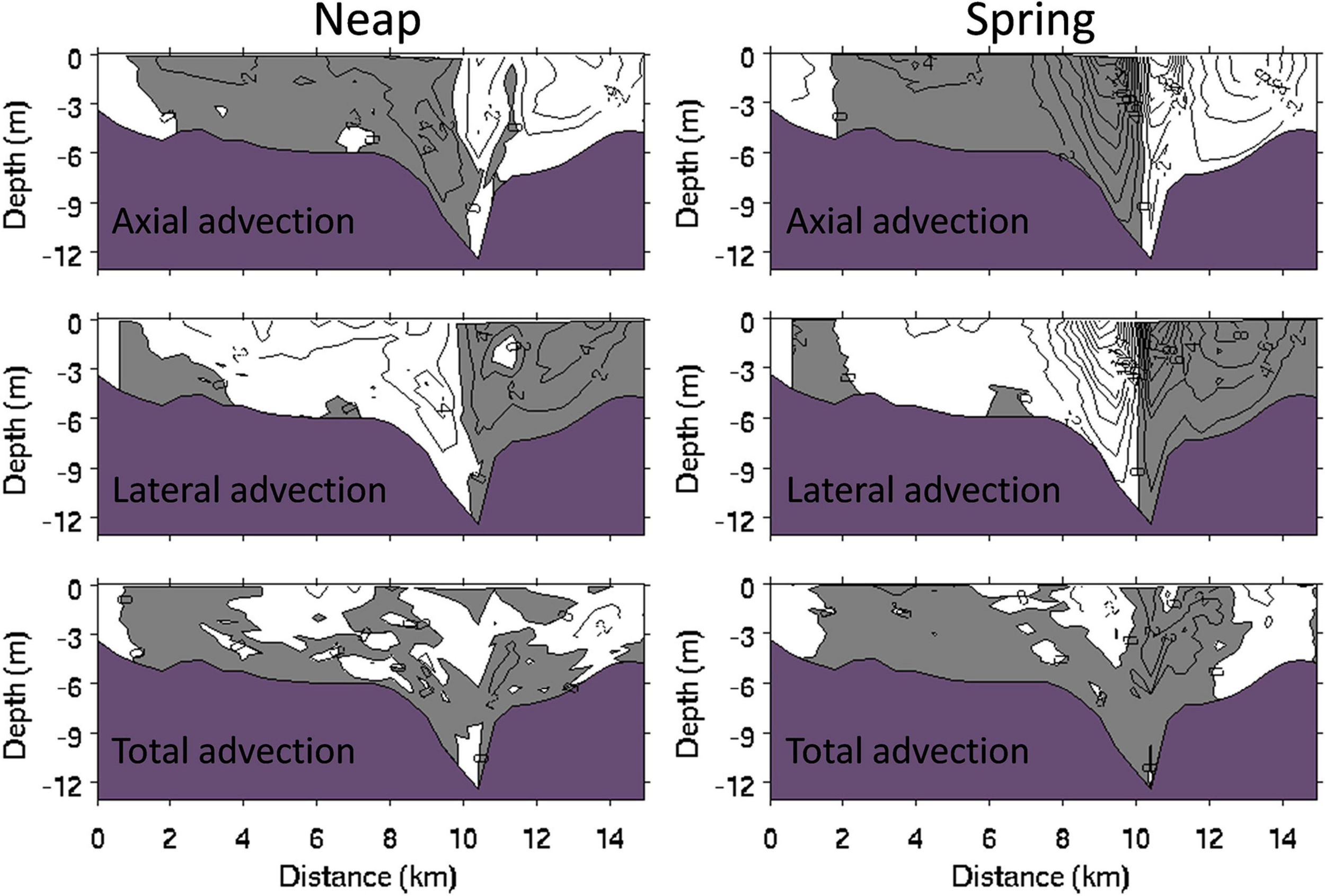 Distributions of the subtidal axial, lateral, and total advections along the cross-channel section S (×10– 5 m2/s) at maximal neap and spring tides. Positive value indicates the force toward land. The x-axis represents the distance from the west to the east shoals as one looks into the PRE.
