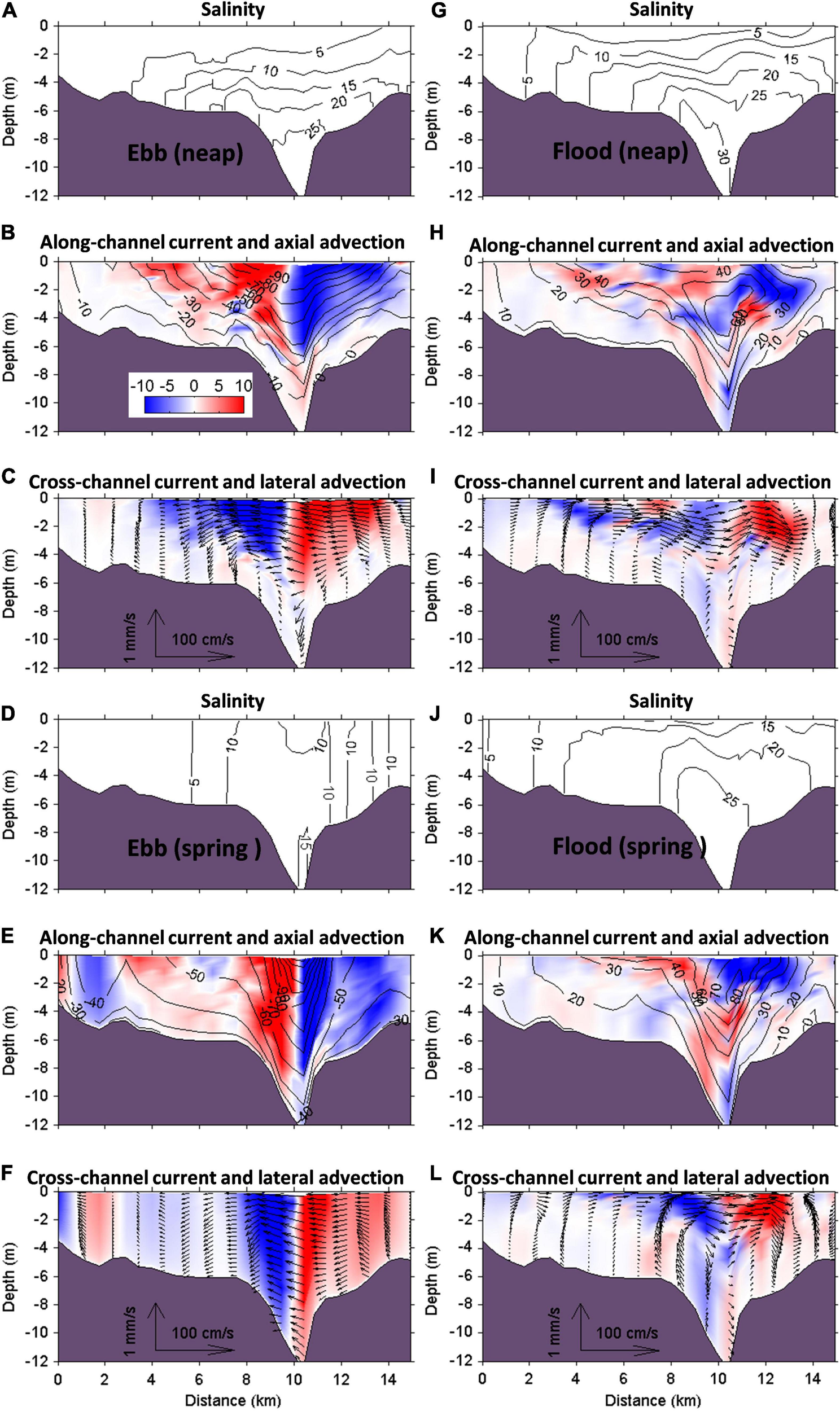 Instantaneous salinity, along-channel current velocity (contour line) with axial advection (color shape), and cross-channel current velocity (contour line) with lateral advection (color shape) at maximal ebb during neap tide (A–C), maximal ebb during spring tide (D–F), maximal flood during neap tide (G–I), and maximal flood during spring (J–L) along the cross-channel section S. The positive along-channel current directs toward land, and positive cross-channel current directs from the west toward the east shoals as one looks into the PRE.