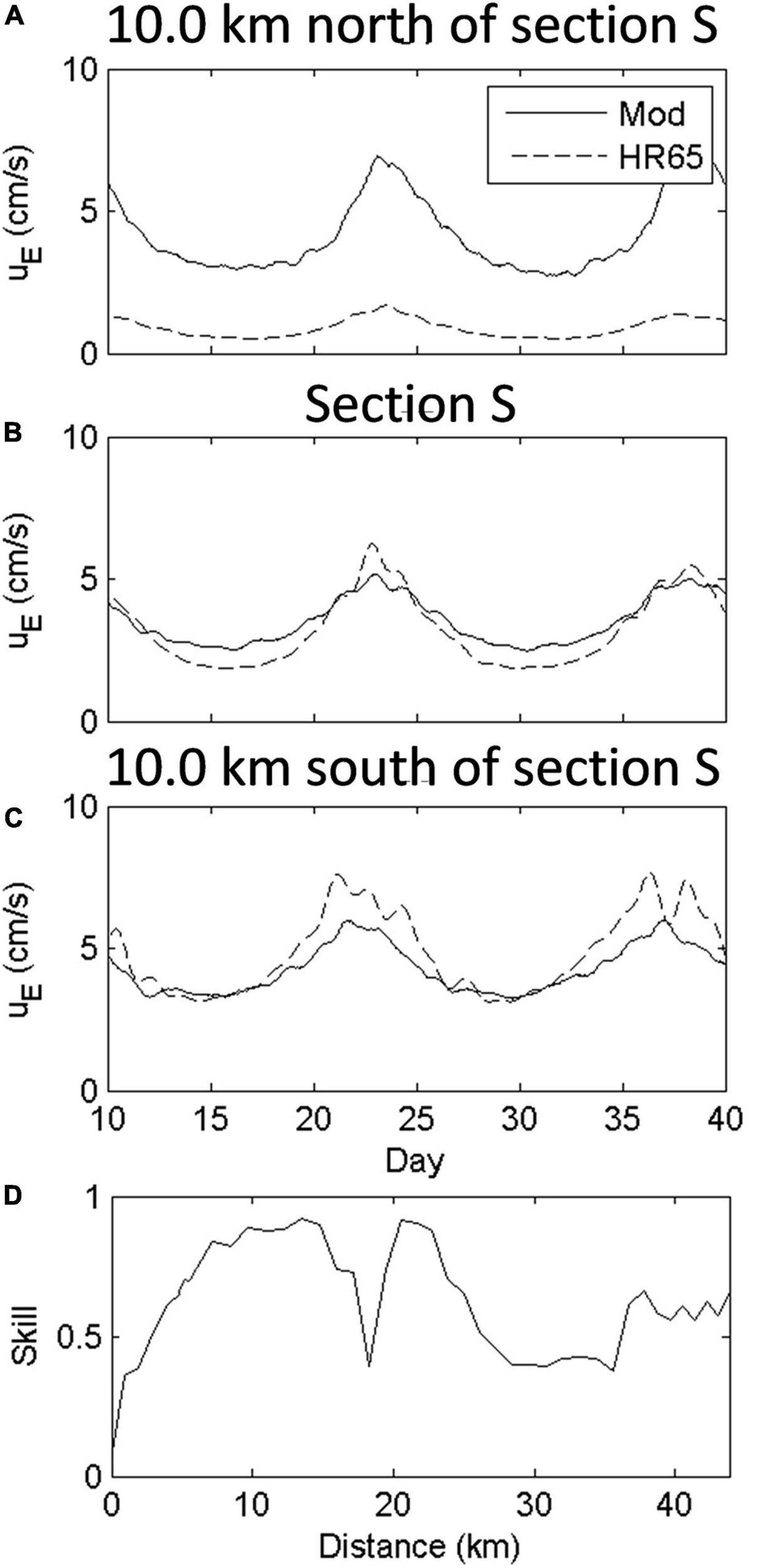 in which Xprediction and Xmod represent prediction and model result, respectively. The overbar indicates a time average. As we expected, the comparisons in Figure 10 show good skill between model results and predictions by HR65’s theory at the lower (10.0 km south of section S) and middle (section S) portions of the PRE. The prediction skill reaches 0.9 in this region (Figure 10D). Despite this, the HR65’s theory still underestimates the SEC at the middle PRE during spring tide (around days 15.5 and 30). This is because the HR65’s theory excludes the contribution of nonlinearity that is still measurable at this region (Figure 7). Compared with the middle PRE, however, HR65’s prediction shows a good skill during spring tide in the lower portion of PRE where nonlinearity is pretty small (Figure 7). During neap tide (around days 23 and 37.5), the HR65’s theory overestimates the SEC both in the two portions when the impact of nonlinear advection is minor. The prediction skill is much reduced in the intermediate region (around 17.0 km) of the two portions. It can be seen that the cross-sectionally averaged nonlinear advection in this region is larger, which can modify the SEC (Figure 7). This large nonlinear advection is caused by the sharp shrink of channel width (inserted image in Figure 1B) in this region. The poor prediction skill of 0.5 is shown in the upstream (10.0 km north of section S), where the HR65’s theory apparently underestimates the SEC. This is understood as this region is beyond the central region with constant horizontal density gradient and it is highly influenced by the freshwater discharge from the Henmen, Hongqimen, and Jiaomen inlets that dominate the west shoal.