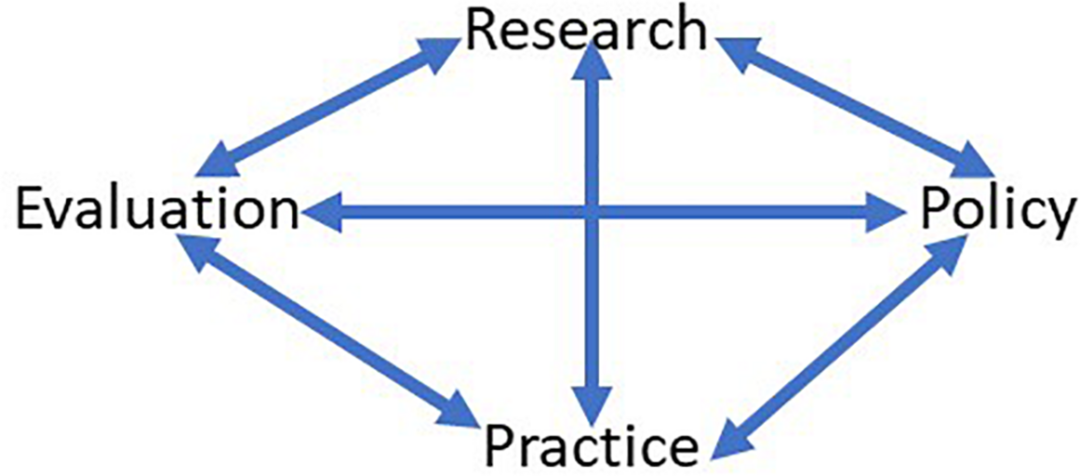 Necessary connections among community-oriented climate adaptation research, policy development and implementation, results and consequences of putting policies into practice, and evaluation and adaptive learning from applications. Bidirectional areas indicate two/multi-way information flows.
