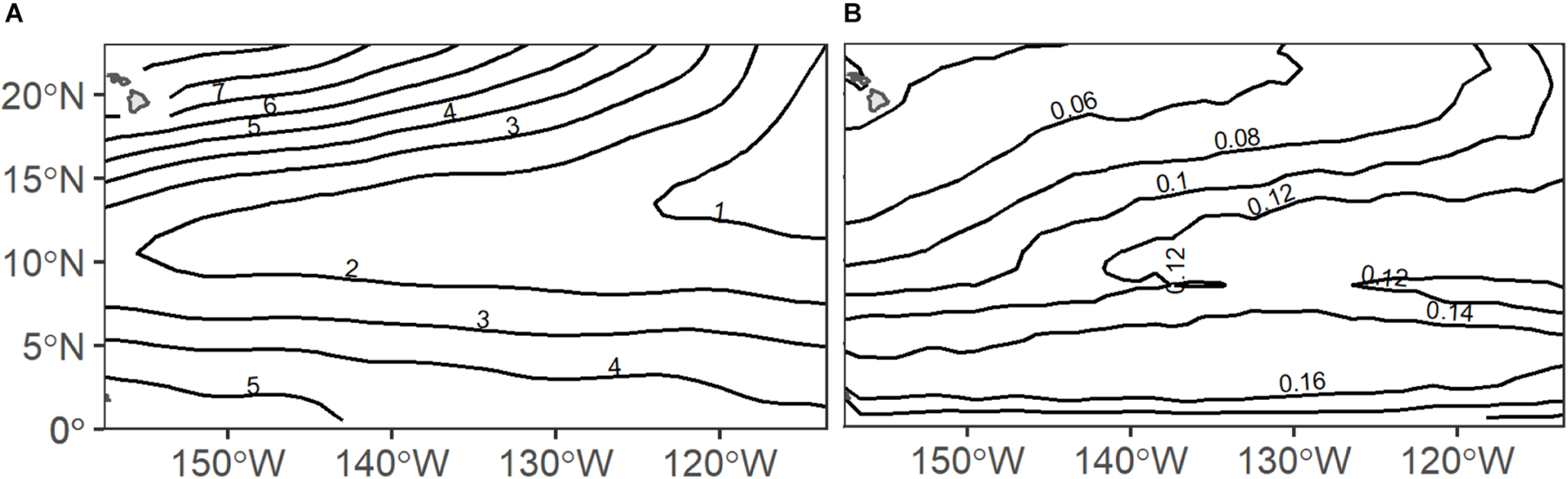 Annual climatologies of (A) midwater oxygen partial pressure (pO2; kPa) and (B) surface chlorophyll (chl-a; mg m–3) across the eastern Central Pacific Ocean (source details in Table 1).