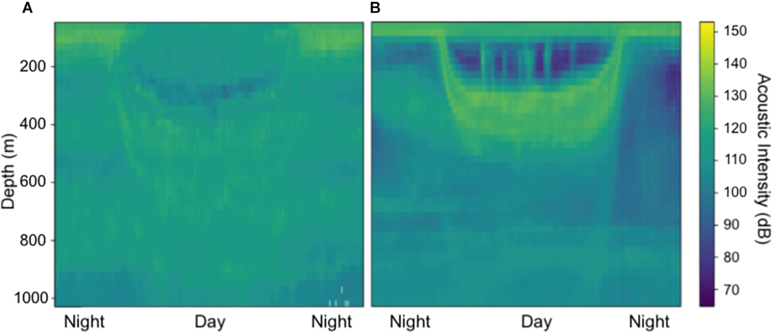 I dB was calculated by integrating the acoustic intensity of each vertical profile (below 200 m) within 3 h around local solar midnight or noon. Then, we selected the median integrated value to represent IdB. We did not correct for total water column changes between day and night acoustic intensities in our calculations of DVMp due to lack of measurements in the shallowest 30–50 m as described previously. We further removed days or nights with > 5 noisy intervals within the noon or midnight time periods.
