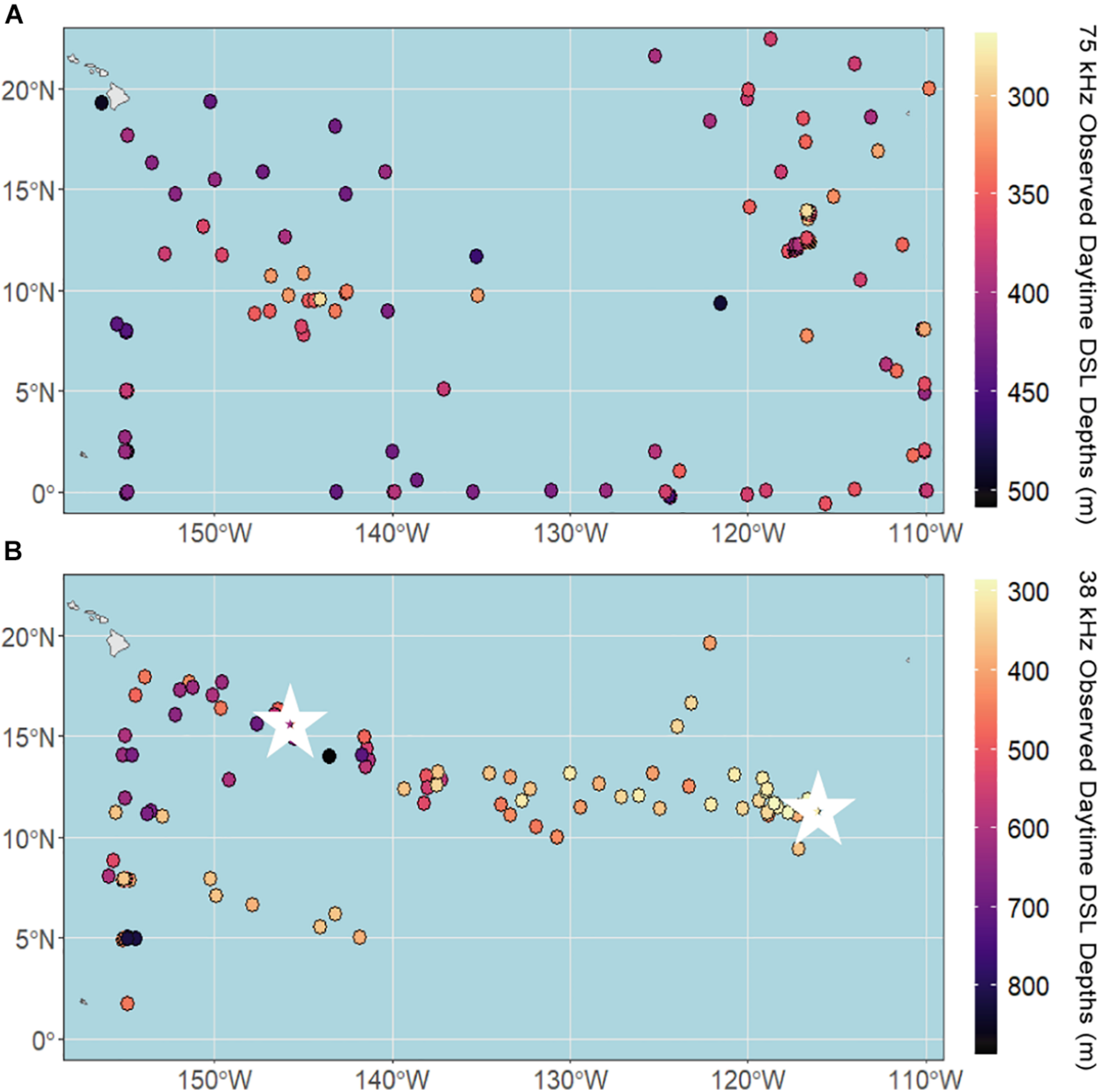 Observed daytime deep scattering layer (DSL) depths across the CCZ region calculated from shipboard ADCP data between 2004 and 2019 at (A) 75 kHz and (B) 38 kHz. White stars indicate the locations of echogram examples (Figure 2).