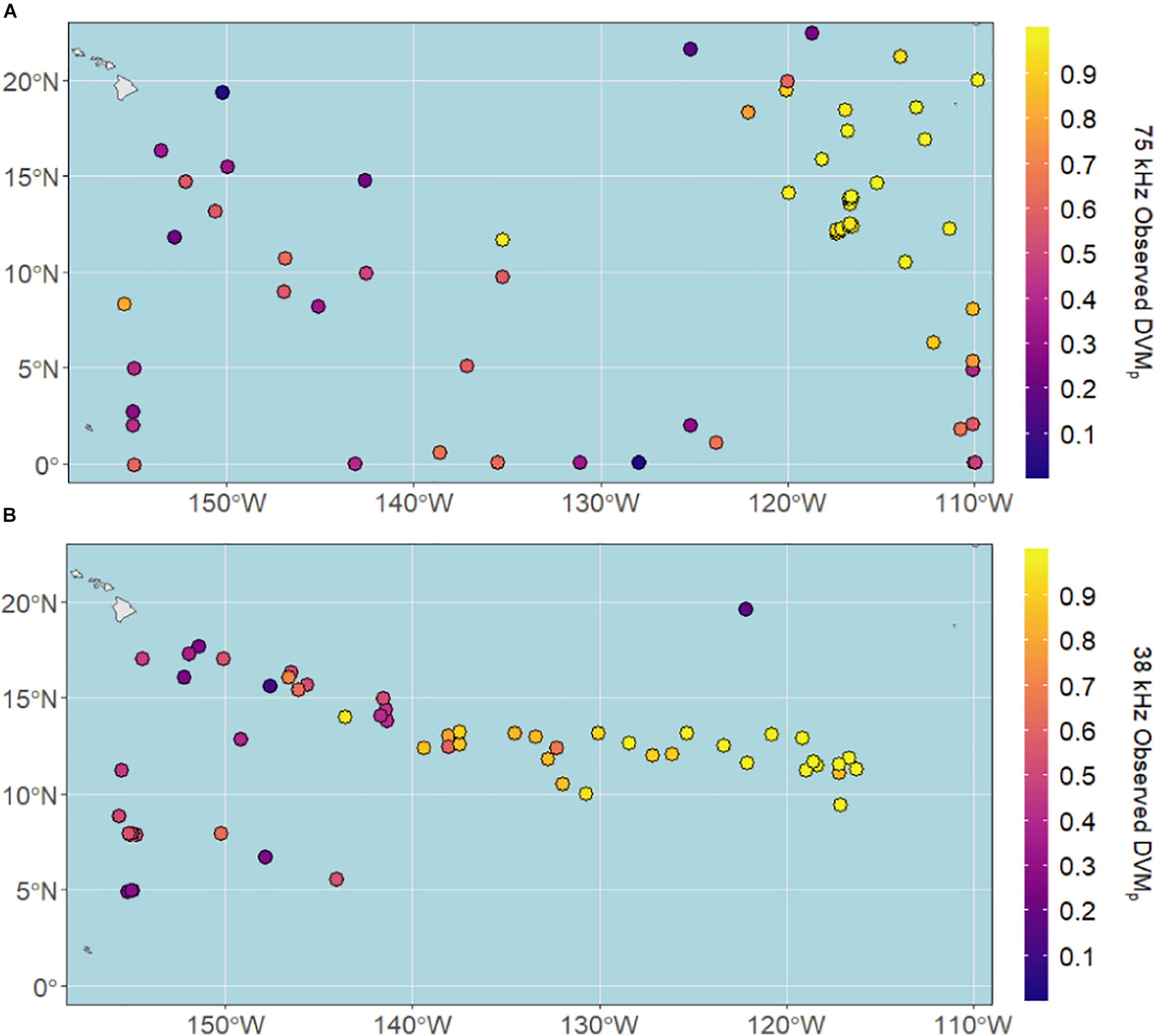DVMp ranged from 0.03 to 0.99 at 75 kHz and 0.11 to 0.99 at 38 kHz, with median proportions of 0.86 and 0.63, respectively. DVMp was highest in the eastern and central CCZ for both datasets (Figure 4), largely overlying the most hypoxic waters of the eastern tropical Pacific.