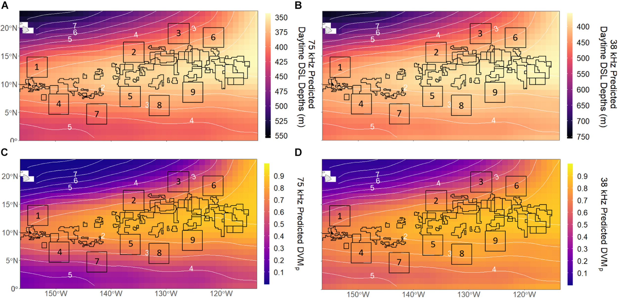 Annual mean 1 × 1° predictions for daytime deep scattering layer (DSL) depths at (A) 75 kHz and (B) 38 kHz and vertical migration proportions (DVMp) at (C) 75 kHz and (D) 38 kHz across the CCZ. Numbered boxes indicate Areas of Particular Environmental Interest (APEIs) and all other polygons represent mining exploration claim areas designated by the International Seabed Authority (ISA). White numbered contours represent mean midwater oxygen partial pressure (pO2; kPa).