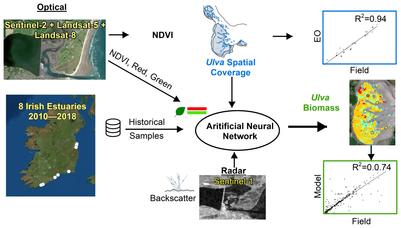 The primary goal of the current study was to evaluate remote sensing as a supplementary tool for the monitoring of macroalgal blooms in Irish estuaries, where the presence of higher cloud coverage places an additional constraint. In this study, macroalgal bloom mapping based on satellite imagery was compared with in situ mapping for ground-truthing and validation purposes. The potential of machine learning methodologies was explored to map the biomass distribution since the higher resolution of the newer sensors, such as Sentinel-2 with 5-day revisit time and 10 m spatial resolution, accompanied by the greater size of the data, demands robust computing resources. The integration of these approaches in EO can take advantage of the recent technological advances in the field of data science and artificial intelligence (Ali et al., 2015). To address this challenge, the potential of an ANN was explored using the information extracted from Sentinel-1 radar backscatter and Sentinel-2 optical reflectance. The historical biomass data collected from field surveys were combined with the data obtained from the EO to develop the biomass model.