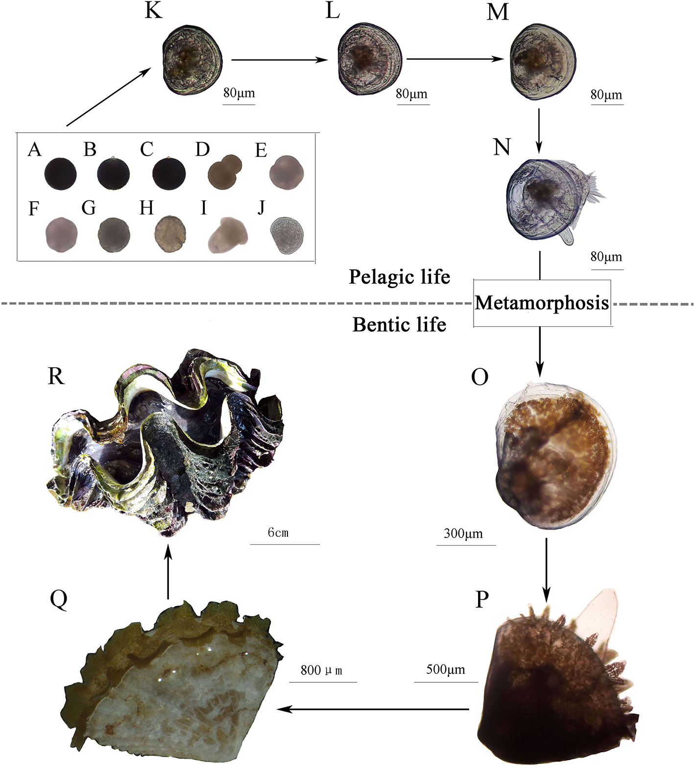 Life cycle of giant clams (T. squamosa). (A) Fertilized egg; (B) First polar body; (C) Second polar body; (D) Two cells; (E) Four cells; (F) Eight cells; (G) Mulberry; (H) Blastocyst; (I) Trochophore; (J) D larva; (K) Early umbo-larva; (L) Middle umbo-larva; (M) Late umbo-larva; (N) Pediveliger; (O) Newly-formed spat; (P) Spat; (Q) Youth; (R) Adult.