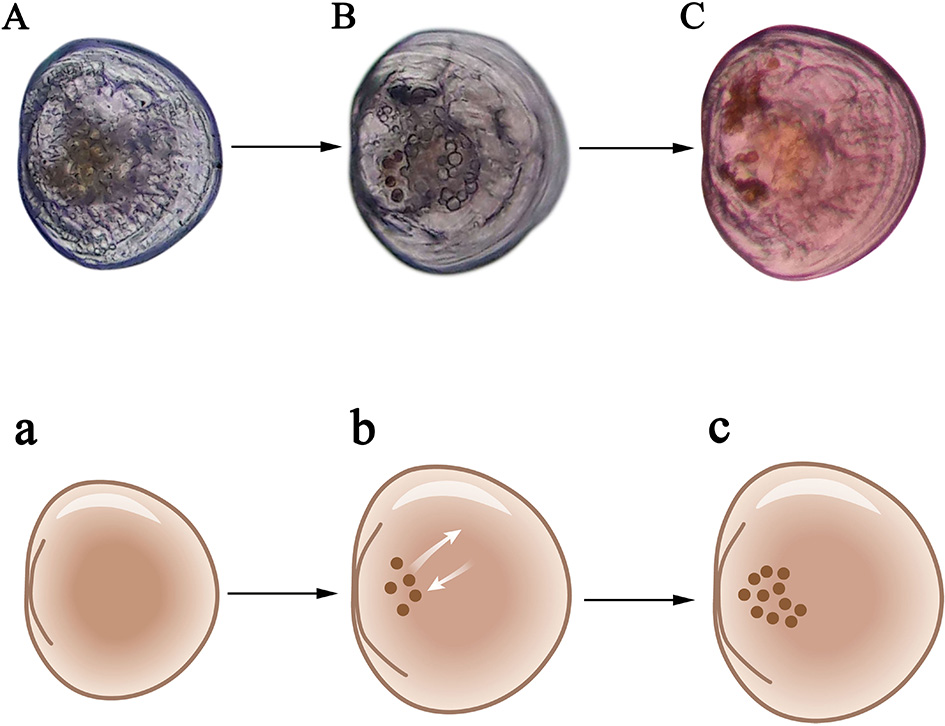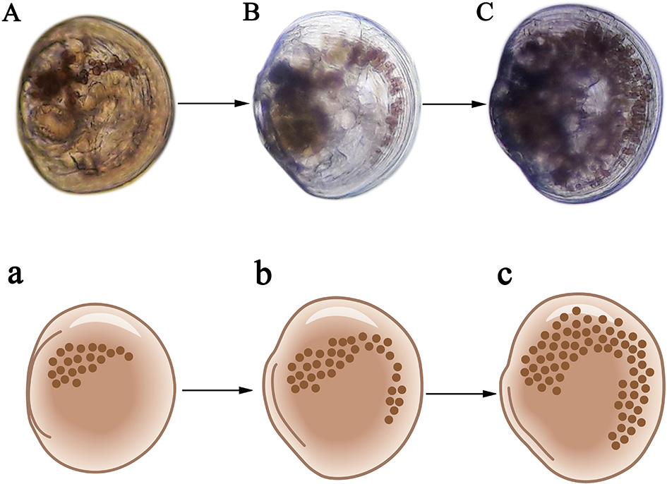 Criteria for successful implantation of zooxanthellae for larvae. (A) Late umbo-larvae; (B) Pediveliger which begins feeding on zooxanthellae; (C) Mature pediveliger with over 10 zooxanthellae. a–c are schematic diagrams corresponding to (A–C).