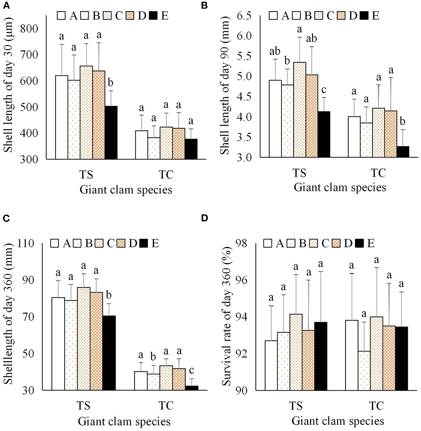 Effects of zooxanthellae clades A–E on growth and survival indices of T. squamosa and T. crocea progeny. (A) Shell length at day 30; (B) Shell length at day 90; (C) Shell length at day 360; (D) Survival rate at day 360.