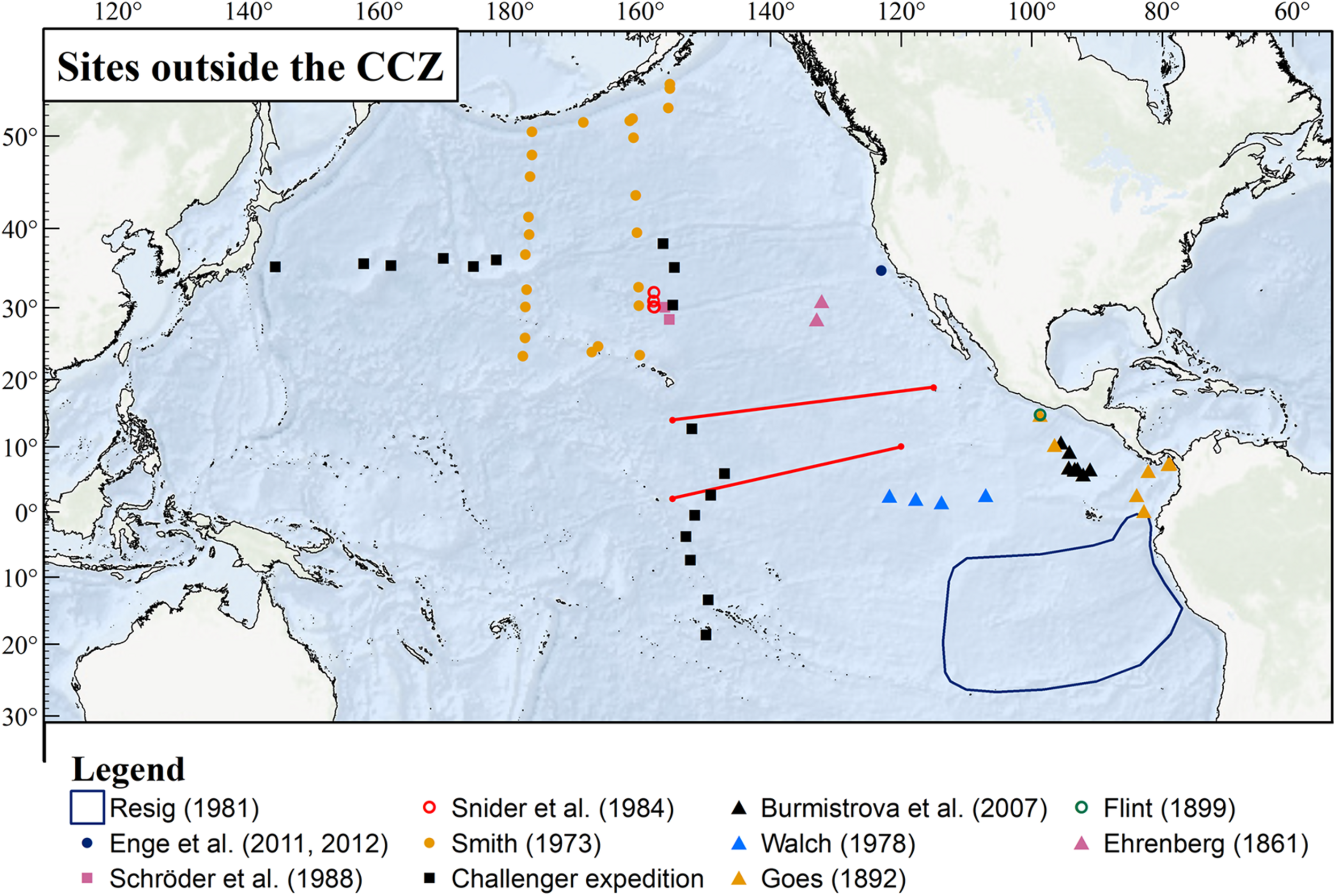 The location of selected studies and sampling sites in the Pacific Ocean. Apart from two Challenger stations at the western end of the CCZ, all are located outside of the CCZ. The Clarion and Clipperton Fractures that delimit the CCZ are marked with red lines; the dark blue line outlines the Resig (1981) study area.
