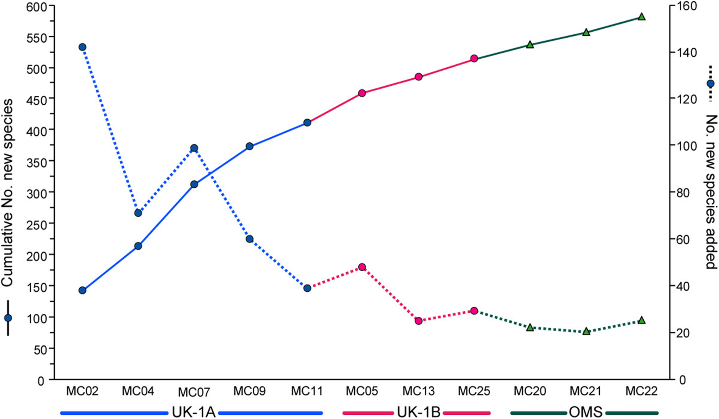 Species accumulation curve (solid line; left-hand axis) showing the increase in the number of species with the addition of new samples from Strata A and B in the UK-1 contract area and the single Stratum in the OMS area (the ‘strata’ are 30 × 30 km study areas). The dotted line shows the number of new species added with each new sample (right-hand axis). Redrawn from Deep-Sea Research I, vol. 149, A. Goineau and A.J. Gooday, Diversity and spatial patterns of foraminiferal assemblages in the eastern Clarion–Clipperton zone (abyssal eastern equatorial Pacific), Article 103036, 2019, with permission from Elsevier.